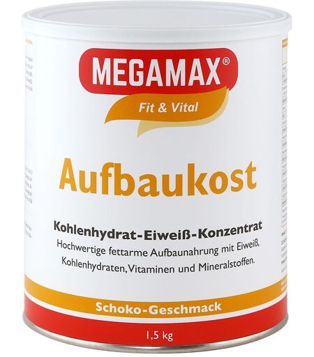 Bitte achten Sie auf eine abwechslungsreiche und ausgewogene Ernährung und gesunde Lebensweise.MEGAMAX Aufbaukost – leckere Shakes für mehr Energie MEGAMAX Aufbaukost ist eine wohlschmeckende, fettarme und leicht verzehrbare Aufbaunahrung mit vielen lebenswichtigen Nährstoffen. Die Aufbaunahrung enthält Kohlenhydrate, Eiweiß, Vitamine und Mineralstoffe. Ein großer Vorteil von MEGAMAX Aufbaukost ist die gute Bekömmlichkeit. Durch den geringen Fettanteil sind die Aufbaukost-Drinks gut und schnell verdaulich. So können Mahlzeiten ergänzt oder die Drinks gut als Zwischenmahlzeit genossen werden. Megamax Aufbaukost - als Zusatznahrung bestens geeignet: zur Kräftigung und bei Untergewicht für die körperliche und geistige Leistungsfähigkeit bei körperlichen Belastungen bei Nährstoffmangel im Alter ideal für Erholungsphasen nach medizinischen Behandlungen gut löslich - leicht verzehrbar von Natur aus glutenfrei MEGAMAX Aufbaukost hat als Hauptbestandteil langkettiges Maltodextrin und nur einen geringen Teil an schnell verwertbaren Kohlenhydraten (Glucose 17 %). Ganz wichtig ist der Anteil an komplexen langkettigen Kohlenhydraten auf Basis von hochwertigen Maltodextrinen. So bleibt der Blutzuckerspiegel über längere Zeiträume stabil und damit die Leistungsfähigkeit erhalten. Der Eiweißanteil beträgt 22 %. Eiweiß trägt zu einer Zunahme und Erhaltung von Muskelmasse und zur Erhaltung normaler Knochen bei. Die Mineralstoffe Calcium und Magnesium sorgen zudem in Verbindung mit den Vitaminen B6, B12, Pantothensäure und Niacin für einen normalen Energiestoffwechsel. B-Vitamine unterstützen das Nervensystem und sorgen für normale psychische Funktionen. Biotin, Niacin, Riboflavin leisten einen Beitrag zur Erhaltung gesunder Schleimhäute. Hauptbestandteil der Aufbaunahrung sind langkettige Kohlenhydrate, die wichtig für eine optimierte Energiezufuhr sind. MEGAMAX Aufbaukost ist von Natur aus glutenfrei. MEGAMAX Kombinationen für noch mehr Eiweiß und Kalorien Je nach individuellem Bedarf besteht die Möglichkeit, in einem Drink die Kalorien und/oder den Eiweißanteil zu erhöhen. Kombinieren Sie dazu MEGAMAX Aufbaukost je nach Bedarf mit MEGAMAX Whey Protein und/oder MEGAMAX MCT-Speiseöl. Kalorienanreicherung mit MEGAMAX MCT-Öl MEGAMAX MCT-Öl ist schnell im Energiestoffwechsel verfügbar und ist gut geeignet bei Gallenblasen - und Bauchspeicheldrüsen-Problemen. MCT-Speiseöl ist geschmacksneutral. Empfohlene Zubereitung: Lösen Sie 30 g Aufbaukost-Pulver und 10 g MCT-Öl in 300 ml Vollmilch. Kräftig umrühren und genießen. Dieser Shake enthält 396 kcal. Eiweißanreicherung mit MEGAMAX Whey Protein Whey Protein ist biologisch hochwertig und wird schnell aufgenommen. Eiweiß hat viele wichtige Funktionen im Körper, vom Immunsystem bis zum Erhalt und Aufbau von Muskelsubstanz. Empfohlene Zubereitung: 1 EL (15 g) Eiweißpulver und eine Portion Aufbaukost Pulver mit 300 ml Milch mixen, lösen und trinken. Dieser Shake enthält 30 g Eiweiß und 363 kcal. Zutaten Maltodextrin (41 %),... ...