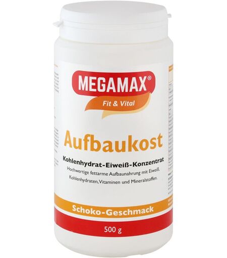 Bitte achten Sie auf eine abwechslungsreiche und ausgewogene Ernährung und gesunde Lebensweise.MEGAMAX Aufbaukost – leckere Shakes für mehr Energie MEGAMAX Aufbaukost ist eine wohlschmeckende, fettarme und leicht verzehrbare Aufbaunahrung mit vielen lebenswichtigen Nährstoffen. Die Aufbaunahrung enthält Kohlenhydrate, Eiweiß, Vitamine und Mineralstoffe. Ein großer Vorteil von MEGAMAX Aufbaukost ist die gute Bekömmlichkeit. Durch den geringen Fettanteil sind die Aufbaukost-Drinks gut und schnell verdaulich. So können Mahlzeiten ergänzt oder die Drinks gut als Zwischenmahlzeit genossen werden. Megamax Aufbaukost - als Zusatznahrung bestens geeignet: zur Kräftigung und bei Untergewicht für die körperliche und geistige Leistungsfähigkeit bei körperlichen Belastungen bei Nährstoffmangel im Alter ideal für Erholungsphasen nach medizinischen Behandlungen gut löslich - leicht verzehrbar von Natur aus glutenfrei MEGAMAX Aufbaukost hat als Hauptbestandteil langkettiges Maltodextrin und nur einen geringen Teil an schnell verwertbaren Kohlenhydraten (Glucose 17 %). Ganz wichtig ist der Anteil an komplexen langkettigen Kohlenhydraten auf Basis von hochwertigen Maltodextrinen. So bleibt der Blutzuckerspiegel über längere Zeiträume stabil und damit die Leistungsfähigkeit erhalten. Der Eiweißanteil beträgt 22 %. Eiweiß trägt zu einer Zunahme und Erhaltung von Muskelmasse und zur Erhaltung normaler Knochen bei. Die Mineralstoffe Calcium und Magnesium sorgen zudem in Verbindung mit den Vitaminen B6, B12, Pantothensäure und Niacin für einen normalen Energiestoffwechsel. B-Vitamine unterstützen das Nervensystem und sorgen für normale psychische Funktionen. Biotin, Niacin, Riboflavin leisten einen Beitrag zur Erhaltung gesunder Schleimhäute. Hauptbestandteil der Aufbaunahrung sind langkettige Kohlenhydrate, die wichtig für eine optimierte Energiezufuhr sind. MEGAMAX Aufbaukost ist von Natur aus glutenfrei. MEGAMAX Kombinationen für noch mehr Eiweiß und Kalorien Je nach individuellem Bedarf besteht die Möglichkeit, in einem Drink die Kalorien und/oder den Eiweißanteil zu erhöhen. Kombinieren Sie dazu MEGAMAX Aufbaukost je nach Bedarf mit MEGAMAX Whey Protein und/oder MEGAMAX MCT-Speiseöl. Kalorienanreicherung mit MEGAMAX MCT-Öl MEGAMAX MCT-Öl ist schnell im Energiestoffwechsel verfügbar und ist gut geeignet bei Gallenblasen - und Bauchspeicheldrüsen-Problemen. MCT-Speiseöl ist geschmacksneutral. Empfohlene Zubereitung: Lösen Sie 30 g Aufbaukost-Pulver und 10 g MCT-Öl in 300 ml Vollmilch. Kräftig umrühren und genießen. Dieser Shake enthält 396 kcal. Eiweißanreicherung mit MEGAMAX Whey Protein Whey Protein ist biologisch hochwertig und wird schnell aufgenommen. Eiweiß hat viele wichtige Funktionen im Körper, vom Immunsystem bis zum Erhalt und Aufbau von Muskelsubstanz. Empfohlene Zubereitung: 1 EL (15 g) Eiweißpulver und eine Portion Aufbaukost Pulver mit 300 ml Milch mixen, lösen und trinken. Dieser Shake enthält 30 g Eiweiß und 363 kcal. Zutaten Maltodextrin (41 %),... ...