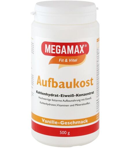 Bitte achten Sie auf eine abwechslungsreiche und ausgewogene Ernährung und gesunde Lebensweise. MEGAMAX Aufbaukost – leckere Shakes für mehr Energie MEGAMAX Aufbaukost ist eine wohlschmeckende, fettarme und leicht verzehrbare Aufbaunahrung mit vielen lebenswichtigen Nährstoffen. Die Aufbaunahrung enthält Kohlenhydrate, Eiweiß, Vitamine und Mineralstoffe. Ein großer Vorteil von MEGAMAX Aufbaukost ist die gute Bekömmlichkeit. Durch den geringen Fettanteil sind die Aufbaukost-Drinks gut und schnell verdaulich. So können Mahlzeiten ergänzt oder die Drinks gut als Zwischenmahlzeit genossen werden. Megamax Aufbaukost - als Zusatznahrung bestens geeignet: zur Kräftigung und bei Untergewicht für die körperliche und geistige Leistungsfähigkeit bei körperlichen Belastungen bei Nährstoffmangel im Alter ideal für Erholungsphasen nach medizinischen Behandlungen gut löslich - leicht verzehrbar von Natur aus glutenfrei MEGAMAX Aufbaukost hat als Hauptbestandteil langkettiges Maltodextrin und nur einen geringen Teil an schnell verwertbaren Kohlenhydraten (Glucose 17 %). Ganz wichtig ist der Anteil an komplexen langkettigen Kohlenhydraten auf Basis von hochwertigen Maltodextrinen. So bleibt der Blutzuckerspiegel über längere Zeiträume stabil und damit die Leistungsfähigkeit erhalten. Der Eiweißanteil beträgt 22 %. Eiweiß trägt zu einer Zunahme und Erhaltung von Muskelmasse und zur Erhaltung normaler Knochen bei. Die Mineralstoffe Calcium und Magnesium sorgen zudem in Verbindung mit den Vitaminen B6, B12, Pantothensäure und Niacin für einen normalen Energiestoffwechsel. B-Vitamine unterstützen das Nervensystem und sorgen für normale psychische Funktionen. Biotin, Niacin, Riboflavin leisten einen Beitrag zur Erhaltung gesunder Schleimhäute. Hauptbestandteil der Aufbaunahrung sind langkettige Kohlenhydrate, die wichtig für eine optimierte Energiezufuhr sind. MEGAMAX Aufbaukost ist von Natur aus glutenfrei. Zutaten: Maltodextrin (47 %), Milcheiweiß (24 %), Glucose (17 %), Fruchtzucker (9 %), Aroma, Trennmittel Magnesiumcarbonat, Vitaminmischung (L-Ascorbinsäure, Nicotinsäureamid, D-alpha-Tocopherylacetat, Calciumpantothenat, Pyridoxinhydrochlorid, Riboflavin, Thiaminhydrochlorid, Biotin, Cyanocobalamin, Pteroylmonoglutaminsäure). Hinweis für Allergiker: Enthält Milcheiweiß. Nährwerte: Durchschn.Nährwerte pro 100 g NRV* Pro Portion 50 g Pulver in 180 ml WasserNRV* Pro Portion 30 g Pulver in 300 ml Vollmilch (3,5 % Fett) NRV* Pro Portion 30 g Pulver in 300 ml Vollmilch (3,5% Fett) +10 g MCT Öl Energie 1633 kJ 385 kcal 490 kJ 115 kcal 1292 kJ 307 kcal 1662 kJ 397 kcal Fett - davon ges. Fettsäuren 0,36 g 0,26 g 0,11 g 0,08 g 10,61 g 6,98 g 20,61 g 16,98 g Kohlenhydrate - davon Zucker 73,35 g 26,02 g 22 g 7,8 g 36,11 g 21,98 g 36,12 g 21,91 g Ballaststoffe 0 g 0 g 0 g 0 g Eiweiß 22 g250 6,6 g 125 % 16,8 g 16,8 g Salz 2,98 g250 0,89 g 125 % 1... ...