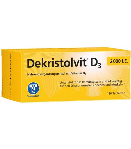 Anwendungsgebiet von Dekristolvit D3 2.000 I.e. TablettenDekristolvit D3 2.000 I.e. Tabletten sind ein Nahrungsergänzungsmittel mit dem Sonnenvitamin Vitamin D3, dass die Immunabwehr unterstützen kann und eine wichtige Bedeutung für den Erhalt normaler Knochen und Muskeln hat. Dekristolvit D3 2.000 I.E. Tabletten für Ihre Vitamin D-Versorgung. Vitamin D-Unterversorgung vermeiden mit Dekristolvit D3 2.000 I.E. Tabletten. Vitamin D hat Einfluss auf zahlreiche Abläufe im Körper: Das Vitamin mit Schlüsselfunktion wirkt regulierend auf das Immunsystem, sorgt für starke Knochen( bei Osteoporose) und gesunde Zähne, unterstützt die Muskelarbeit und ist beteiligt an der Zellteilung. Ein Großteil der Deutschen jedoch ist nicht ausreichend mit Vitamin D (Colecalciferol) versorgt, die Unterversorgung erstreckt sich über alle Altersklassen. Dekristolvit D3 2.000 I.E. Tabletten unterstützen wirksam das Immunsystem, Knochen und Muskulatur. Durch Vitamin D wird die Aufnahme von Calcium, das für viele Körperfunktionen benötigt wird, deutlich verbessert. Frei von Gluten, Laktose, Fructose und Gelatine sind sie sehr gut verträglich. Dekristolvit D3 2.000 I.E. Tabletten – für ausreichend Vitamin D im Blut Dosierung ab 1 Tablette täglich für eine ausreichende Versorgung Für Kinder ab 11 Jahren, Jugendliche und Erwachsene In Deutschland hergestellt und entwickelt Hinweise auf eine Unterversorgung mit Vitamin D. Mögliche Anzeichen einer Unterversorgung können Muskelkrämpfe und -schmerzen sowie eine höhere Infektanfälligkeit sein. Dekristolvit D3 2.000 I.E. Tabletten können helfen, den täglichen Bedarf an Vitamin D zu decken. HÄUFIGE FRAGEN & ANTWORTEN Wie hoch ist die maximale Tagesdosis von Dekristolvit D3 2.000 I.E. Tabletten? Die Europäische Behörde für Lebensmittelsicherheit hat für die tägliche Vitamin D-Zufuhr maximale Werte festgelegt, die nicht überschritten werden so ...