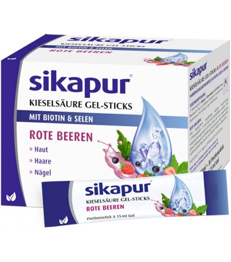 Anwendungsgebiet von Sikapur Kieselsäure Gel-sticks rote BeerenSikapur Kieselsäure Gel-sticks rote Beeren sind ein Nahrungsergänzungsmittel mit Biotin zum Erhalt normaler Haut und Haare, Selen zur Erhaltung normaler Haare und Nägel sowie Silicium. Wirkungsweise von Sikapur Kieselsäure Gel-sticks rote BeerenDurch eine gezielte Nährstoffversorgung können wir frisches, gesundes und strahlendes Aussehen ganz einfach von innen heraus unterstützen. Hierfür bietet die Natur ein nahezu unerschöpfliches Angebot. Eines dieser natürlichen Multitalente ist das essentielle Spurenelement Silicium, wie es beispielsweise in sikapur Kieselsäure Präparaten vorliegt. Zwar befinden sich in unserem Körper insgesamt nur etwa 1,4 Gramm, trotzdem ist Silicium in fast jeder Zelle vorhanden und für straffe Haut, kräftige Haare, feste Nägel und ein straffes Bindegewebe unerlässlich.Wirkstoffe / Inhaltsstoffe / ZutatenSikapur Kieselsäure Gel-sticks rote Beeren enthält: Zutaten: Füllstoff: Sorbit Trimagnesiumcitrat 9 Hydrat (30,48%), Magnesiumoxid (27,38%), Säuerungsmittel: Zitronensäure, Fruchtpulver Orange (2,86%), Farbstoff: Eisenoxid, Trennmittel: Tricalciumphosphat, Orangenaroma, Trennmittel: Magnesiumsalze der SpeisefettsäurenGegenanzeigenBei bekannter Überempfindlichkeit gegen einen der oben genannten Inhaltsstoffe sollte dieses Produkt nicht angewendet werden.DosierungVerzehrungsempfehlung von Sikapur Kieselsäure Gel-sticks rote Beeren: 1 Portionsstick (15 ml) am Tag zur direkten Einnahme zwischen den Mahlzeiten. Vor Gebrauch gut durchkneten. Es empfiehlt sich eine Einnahme über 8-12 Wochen, da die Haut, Haare und Nägel Zeit zur Erneuerung benötigen. HinweiseNahrungsergänzungsmittel sind kein Ersatz für eine ausgewogene und abwechslungsreiche Ernährung und gesunde Lebensweise. Bitte außerhalb der Reichweite von kleinen Kindern aufbewahren. Sikapur Kieselsäure ...