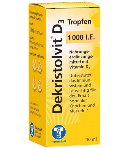 Anwendungsgebiet von Dekristolvit D3 1.000 I.e. TropfenDekristolvit D3 1.000 I.e. Tropfen sind ein Nahrungsergänzungsmittel mit Vitamin D3 und unterstützen wirksam das Immunsystem, Knochen und Muskulatur. Zudem unterstützen sie die Knochengesundheit. Durch Vitamin D wird die Aufnahme von Calcium, das für viele Körperfunktionen benötigt wird, deutlich verbessert. Frei von Gluten, Laktose, Fructose und Gelatine sind sie sehr gut verträglich.Wirkungsweise von Dekristolvit D3 1.000 I.e. TropfenDas Besondere an Dekristolvit D3 1.000 I.e. Tropfen: Vitamin D3 ist an vielen Stoffwechselvorgängen und Funktionen im Körper beteiligt, hierzu zählen ua.: Aufbau von Knochen, Zähnen und Gelenken, Steuerung der Aufnahme von Calcium im Darm, das Immunsystem zu stärken und Infekte abzuwehren, aber auch die Zellen zu teilen und Entzündungen im Körper zu reduzieren. Dekristolvit D3 1.000 I.e. Tropfen können zur Gesunderhaltung beitragen.Wirkstoffe / Inhaltsstoffe / ZutatenDekristolvit D3 1.000 I.e. Tropfen enthalten: Zutaten: Mittelkettige Triglyceride, Cholecalciferol Nährstoffe pro Verzehrsempfehlung / RM (%)* Vitamin D3 25 µg ( 1000 I.E.) / 500 *RM = Referenzmenge für die tägliche Zufuhr gemäß LebensmittelinformationsverordnungGegenanzeigenBei bekannter Überempfindlichkeit gegenüber einem der oben genannten Inhaltsstoffe sollte dieses Produkt nicht angewendet werden.DosierungAnwendungsempfehlung von Dekristolvit D3 1.000 I.e. Tropfen: Täglich 2 Tropfen zu einer Mahlzeit verzehren. Die angegebene empfohlene Verzehrsmenge darf nicht überschritten werden. HinweiseDie angegebene empfohlene Verzehrsmenge darf nicht überschritten werden. Nahrungsergänzungsmittel sollten nicht als Ersatz für eine ausgewogene und abwechslungsreiche Ernährung und eine gesunde Lebensweise verwendet werden. Außerhalb der Reichweite von kleinen Kindern aufbewahren. Zur verb ...