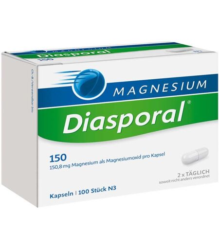 Anwendungsgebiet von Magnesium Diasporal 150 KapselnBei nachgewiesenem Magnesiummangel, wenn er Ursache für Störungen der Muskeltätigkeit (Störungen der Muskulatur und der Nerven, Wadenkrämpfe) ist.Wirkungsweise von Magnesium Diasporal 150 KapselnGegen Krämpfe und Verspannungen durch Magnesiummangel. Magnesium-Diasporal® 150 Kapseln sind praktisch für alle, die eine Magnesiumeinnahme ohne Geschmack bevorzugen. Für mehrmals täglich. Wirkstoffe / Inhaltsstoffe / Zutaten250 mg Magnesium oxid150.7 mg Magnesium IonCellulose, mikrokristallin Hilfstoff (+)Gelatine Hilfstoff (+)Macrogol 6000 Hilfstoff (+)Magnesium stearat Hilfstoff (+)Natrium dodecylsulfat Hilfstoff (+)Polyoxyethylen (40) monostearat Hilfstoff (+)Titan dioxid Hilfstoff (+)GegenanzeigenGegen alle Arzneimittel können Überempfindlichkeitsreaktionen auftreten, dann müssen Sie das Medikament sofort absetzen. Wenn schon eine Allergie gegen den Wirkstoff oder einen der sonstigen Bestandteile des Arzneimittels bekannt ist, darf es nicht angewendet werden.Das Arzneimittel darf nicht eingenommen werden bei:- Schweren Nierenfunktionsstörungen- Erkrankung des eigenen Immunsystems mit schwerer Muskelschwäche (Myasthenia gravis)- Störungen der Erregungsweiterleitung im Herzmuskel (AV-Block)Dosierung- Die Menge richtet sich nach dem Grad des Magnesiummangels. - Jugendliche und Erwachsene morgens und abends je 1 Kapsel (entsprechend 250 mg Magnesiumoxid)Einnahme- Die Kapseln sollten mit reichlich Flüssigkeit (z.B. 1 Glas Wasser) eingenommen werden.Patientenhinweise- Es gibt keine zeitliche Begrenzung der Anwendung.SchwangerschaftWährend Schwangerschaft und Stillzeit sollten Sie Medikamente möglichst nur nach Absprache mit Ihrem Arzt oder Apotheker einnehmen!- Gegen die Einnahme in Schwangerschft und Stillzeit bestehen keine Bedenken. Zu Risiken und Nebenwirkungen lesen Sie die Packungsbeilage und fragen Sie Ihre Ärztin, Ihren Arzt oder in Ihrer Apotheke. Magnesium Diasporal 150 K ...
