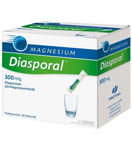 Magnesium-Diasporal® 300 mg, Trinkgranulat Für Muskeln ohne Krämpfe1. Und Tage voller Leben. Magnesium-Diasporal® 300 mg ist das einzige Arzneimittel, das 300 mg Magnesium aus reinem Magnesiumcitrat enthält. Diese organische Verbindung ist körperfreundlich und schnell aktiv*. Für die Basisversorgung. Trinkgranulat mit 300 mg Magnesium pro Stick Leichter Orangengeschmack Nur 1 x täglich – mit 24-Stunden-Langzeiteffekt Einnahme am besten abends Ohne künstliche Süß- und Farbstoffe, enthält Saccharose (Zucker, 0,2 BE) und Natrium Schnell löslich in Wasser, Tee, Saft Sprudelt nicht Ohne tierische Bestandteile – für Veganer geeignet Glutenfrei, laktosefrei Trinkgranulat mit 300 mg Magnesium pro Stick Wirkstoff: Reines körperfreundliches Magnesiumcitrat. Anwendungsgebiet: Behandlung und Vorbeugung eines Magnesiummangels. Enthält Sucrose (Zucker) und Natrium. Dosierung: Falls vom Arzt nicht anders verordnet, ist die übliche Dosis für Erwachsene täglich 1 x 1 Briefchen entsprechend einer Tagesgesamtdosis von 295,7 mg Magnesium-Ionen. Art der Anwendung: Lösen Sie bitte das Granulat in einem Glas Trinkwasser, Fruchtsaft oder Tee auf und trinken Sie den Inhalt des Glases vollständig aus. Bitte sprechen Sie mit Ihrem Arzt oder Apotheker, wenn Sie den Eindruck haben, dass die Wirkung von Magnesium-Diasporal® 300 zu stark oder zu schwach ist. Pflichtangaben: Magnesium-Diasporal® 300 mg, Granulat zur Herstellung einer Lösung zum Einnehmen (Wirkstoff: Magnesiumcitrat) Anwendungsgebiet: Behandlung und Vorbeugung eines Magnesiummangels. Enthält Sucrose (Zucker) und Natrium. Zu Risiken und Nebenwirkungen lesen Sie die Packungsbeilage und fragen Sie Ihren Arzt oder Apotheker. Protina Pharm. GmbH, D-85737 Ismaning ...