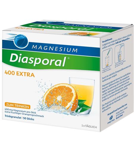 Nahrungsergänzungsmittel sind kein Ersatz für eine abwechslungsreiche und ausgewogene Ernährung und eine gesunde Lebensweise. Nahrungsergänzungsmittel bei erhöhtem Magnesiumbedarf. Mit Süßungsmittel. Ohne Zucker. Das Trinkgranulat der Diasporal® EXTRA-KLASSE. EXTRA stark. EXTRA fruchtig.Vitalisiert Muskeln. Ideal für den erhöhten Magnesiumbedarf. Magnesium-Diasporal® 400 EXTRA enthält reines Magnesiumcitrat, wie es als Baustein im Körper vorkommt. Deshalb körperfreundlich und schnell aktiv. EXTRA stark mit 400 mg Magnesium pro Stick EXTRA fruchtig durch natürliches Orangensaftkonzentrat Nur 1 x täglich Natürlich ohne Zucker, ohne künstliche Farbstoffe Hinweis für Diabetiker: 1 Stick enthält weniger als 0,2 BE Glutenfrei, laktosefrei Trinkgranulat mit 400 mg Magnesium pro Stick Zutaten: Magnesiumcitrat (40,9%; 2579mg/Stick), Orangenfruchtpulver (Maltodextrin, Orangensaftkonzentrat 4,5%), Säuerungsmittel: Zitronensäure, Kaliumhydrogencarbonat, Orangenaroma, Süßungsmittel: Sucralose, Farbstoffe: Riboflavin und Betenrot Nährwerte: Durchschnittliche Nährwerte: pro Stick: Magnesium 400 mg Verzehrempfehlung: 1 x täglich den Inhalt eines Sticks in Wasser (150 ml) auflösen und trinken. Hinweis: Die angegebene tägliche Verzehrmenge darf nicht überschritten werden. Aufbewahrungshinweis: Bitte außerhalb der Reichweite von kleinen Kindern aufbewahren. Nettofüllmengen: 50 Sticks à 6,3 g = 315 g Hersteller: Protina Pharm. GmbH Adalperostr. 37 D-85737 Ismaning ...