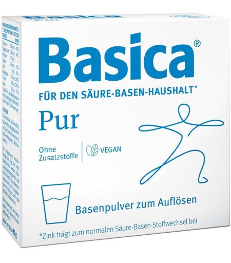 Anwendungsgebiet von Basica Pur PulverBasica Pur Pulver - Für den Säure-Basen-Haushalt* Nahrungsergänzungsmittel mit basischen Mineralstoffen und Spurenelementen. Reines Basenpulver ohne Geschmack. Zum Auflösen in Wasser oder Saft. Zum Einrühren in kalte oder warme Speisen. Basica® mit basischen Mineralstoffen und wertvollen Spurenelementen unterstützt das gesundheitliche Wohlbefinden und Zink den normalen Säure-Basen-Stoffwechsel. Zink trägt zu einem normalen Säure-Basen-Stoffwechsel sowie zu einem regulären Kohlenhydrat- und Fettsäurestoffwechsel bei. Magnesium trägt zur Verringerung von Müdigkeit und Erschöpfung bei. Magnesium und Calcium leisten einen Beitrag zum normalen Energiestoffwechsel. Calcium wird zur Erhaltung normaler Knochen benötigt. Selen unterstützt die normale Funktion des Immunsystems. Basica®. Das Original – überzeugt seit Generationen. *Zink trägt zum normalen Säure-Basen-Stoffwechsel beiWirkstoffe / Inhaltsstoffe / ZutatenZutaten von Basica Pur Pulver: Calciumlactat, Natriumcitrat, Kaliumcitrat, Magnesiumcitrat, Zinkcitrat, Chromchlorid, Natriummolybdat, Natriumselenat Nährwerte pro Tagesportion (2 Sticks) % NRV 1 Tagesportion (2 Sticks) enthält: % NRV Calcium: 550 mg = 69 % Magnesium: 150 mg = 40 % Natrium: 375 mg = - Kalium: 350 mg = 18 % Zink: 5 mg = 50 % Molybdän: 50 μg = 100 % Chrom: 40 μg = 100 % Selen: 30 μg = 55 % % NRV = % des Referenzwertes für die tägliche Nährstoffzufuhr gem. EU-VerordnungGegenanzeigenBei bekannter Überempfindlichkeit gegenüber einem der oben genannten Inhaltsstoffe sollte das Produkt nicht verwendet werden. DosierungVerzehrempfehlung von Basica Pur Pulver: Jeweils morgens und abends den Inhalt eines Sticks in 250 ml Wasser oder Saft auflösen. Kann auch in kalte oder warme Speisen eingerüh ...
