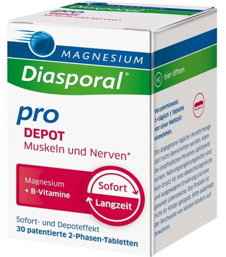 Nahrungsergänzungsmittel sind kein Ersatz für eine abwechslungsreiche und ausgewogene Ernährung und eine gesunde Lebensweise.Für deine Muskeln und Nerven. Magnesium plus B-Vitamine. Um den intensiven Herausforderungen des Alltags (z.B. in Beruf, Studium und Familie) gewachsen zu sein, benötigen wir gesunde Muskeln und Nerven. Hierzu leistet Magnesium-Diasporal® Pro DEPOT Muskeln und Nerven einen sinnvollen Beitrag: Magnesium unterstützt eine normale Muskelfunktion; Vitamin B1, B2, B6 und B12 tragen zu einer normalen Funktion des Nervensystems und des Energiestoffwechsels bei. DEPOT-Effekt: Patentierte 2-Phasen-Tabletten mit Sofort- und Langzeit-Freisetzung Hochdosiert: Kombination aus Magnesium plus Vitamin-B-Komplex Nur 1 x täglich Leicht zu schlucken: Überzug mit angenehmem Vanillegeschmack Bruchkerbe, die einfaches Teilen erlaubt Ohne Zucker, ohne Süßstoffe Vegan, glutenfrei, laktosefrei In wiederverschließbarer Dose Hinweis für Diabetiker: 1 Tablette enthält < 0,1 BENahrungsergänzungsmittel mit 300 mg Magnesium plus Vitamin B-KomplexNährstoffe: Magnesiumcitrat, Magnesiumhydroxid, Magnesiumcarbonat, Vitamine B1, B2, B6, B12Zutaten:Magnesiumcitrat (42%), Magnesiumhydroxid (21%), Magnesiumcarbonat (19%), Geliermittel Natriumalginat, Maisstärke, Füllstoff Sorbit, Überzugsmittel Hydroxypropylmethylcellulose, Stabilisatoren Hydroxypropylcellulose und vernetzte Natriumcarboxymethylcellulose, Farbstoff Eisenoxid, Trennmittel Calciumsalze von Speisefettsäuren und Cellulose und Siliciumdioxid, Überzugsmittel Essigsäureester von Mono- und Diglyceriden von Speisefettsäuren, Vitamin B6, Vitamin B2, Vitamin B1, Aroma, Vitamin B12Nährwerte: Durchschnittliche Nährwerte pro Kapsel NRV Magnesium 300 mg 80 % Vitamin B1 1,1 mg 100 % Vitamin B2 1,4 mg 100 % Vitamin B6 1,4 mg 100 % Vitamin B12 2,5 µg 100 % NRV = Referenzwert für die tägliche Nährstoffzufuhr gemäß EU-Verordnung Verzehrempfehlung: 1 x täglich 1 Tablette vor einer Mahlzeit einnehmen.Hinweis:Die angegebene empfohlene Tagesmenge darf nicht überschritten werden.Aufbewahrung: Kühl (6-25 °C) und lichtgeschützt lagern. Außerhalb der Reichweite von kleinen Kindern aufbewahren.Nettofüllmenge: 30 Tabletten = 48 g Herstellerdaten: Protina Pharm. GmbH 85737 Ismaning Deutschland ...