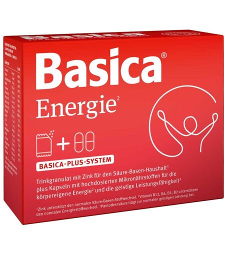 Anwendungsgebiet von Basica Energie Basica Energie - Für körpereigene Energie* und geistige Leistungsfähigkeit** Nahrungsergänzungsmittel mit basischen Mineralstoffen, Spurenelementen und Vitaminen. Trinkgranulat und Kapseln liefern hochdosierte Mikronährstoffe für die körpereigene Energie* und die geistige Leistungsfähigkeit**. Das basische Trinkgranulat unterstützt mit Zink den normalen Säure-Basen-Stoffwechsel. * Vitamin B12, B6, B1, B2, Biotin und Kupfer unterstützen den normalen Energiestoffwechsel. * Magnesium, Folsäure und Niacin tragen dazu bei, Müdigkeit und Erschöpfung zu verringern. ** Pantothensäure trägt zur normalen geistigen Leistung bei. Kalium unterstützt die normale Funktion des Nervensystems und Calcium trägt zu einer normalen Signalübertragung zwischen den Nervenzellen bei. Wirkstoffe / Inhaltsstoffe / ZutatenZutaten von Basica Energie : Basisches Trinkgranulat: Natriumcitrat, Calciumlactat, Säuerungsmittel Zitronensäure, Magnesiumcitrat, Kaliumcitrat, Kaliumhydrogencarbonat, Maltodextrin, natürliches Zitronenaroma, Zinkcitrat, Süßungsmittel Sucralose, Chromchlorid, Natriummolybdat, Natriumselenat. Kapseln: Calciumascorbat, Magnesiumoxid, Hydroxypropylmethylcellulose, Maisstärke, Trennmittel Talkum, Palmfett (ganz gehärtet), Emulgator Mono- und Diglyceride von Speisefettsäuren, Maltodextrin, Calciumpantothenat, Nicotinamid, Pyridoxinhydrochlorid, Riboflavin, Thiaminmononitrat, Mangangluconat, Kupfercitrat, Folsäure, Biotin, Cyanocobalamin. 1 Doppelsachet mit Trinkgranulat und 2 Kapseln enthält: NRV Vitamin C 240 mg 300 % Niacin 16 mg 100 % Pantothensäure 18 mg 300 % Biotin 150 µg 300 % Folsäure 200 µg 100 % Vitamin B1 3,3 mg 300 % Vitamin B2 4,2 mg 300 % Vitamin B6 3,5 mg 250 % Vitamin B12 25 µg 1000 % Mangan 0,5 mg 25 % Kupfer 1 mg ...