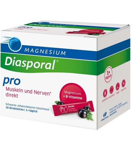 Nahrungsergänzungsmittel sind kein Ersatz für eine abwechslungsreiche und ausgewogene Ernährung und eine gesunde Lebensweise.Für deine Muskeln und Nerven. Magnesium plus B-Vitamine. Um den intensiven Herausforderungen des Alltags (z.B. in Beruf, Studium und Familie) gewachsen zu sein, benötigen wir gesunde Muskeln und Nerven. Hierzu leistet Magnesium-Diasporal® Pro Muskeln und Nerven direkt einen sinnvollen Beitrag: Magnesium unterstützt eine normale Muskelfunktion Vitamin B1, B2, B6 und B12 tragen zur normalen Funktion des Nervensystems und des Energiestoffwechsels bei Hochdosiert: Kombination aus Magnesium plus Vitamin-B-Komplex Ideal für Unterwegs: Schnelle Einnahme ohne Wasser Nur 1 x täglich Angenehmer Schwarze-Johannisbeere-Geschmack Vegan Glutenfrei, laktosefrei, zuckerfrei Hinweis für Diabetiker: 1 Direktstick enthält 0,1 BE Nahrungsergänzungsmittel mit 300 mg Magnesium plus Vitamin B-Komplex Nährstoffe: Magnesiumcitrat, Magnesiumoxid, Vitamine B1, B2, B6, B12Zutaten:Süßungsmittel: Sorbit, Magnesiumcitrat (24%), Magnesiumoxid (23%), Trennmittel: Calciumsalze der Speisefettsäuren, Emulgator: Mono- und Diglyceride von Speisefettsäuren, Vitamin B6, Vitamin B2, Vitamin B1, Aroma, Vitamin B12.Nährwerte: Durchschnittliche Nährwerte: pro Stick NRV Magnesium 300 mg 80 % Vitamin B1 1,1 mg 100 % Vitamin B2 1,4 mg 100 % Vitamin B6 1,4 mg 100 % Vitamin B12 2,5 µg 100 % NRV = Referenzwert für die tägliche Nährstoffzufuhr gemäß EU-VerordnungVerzehrempfehlung: 1x täglich den Inhalt eines Sticks direkt verzehren.Hinweis:Die angegebene empfohlene Tagesmenge darf nicht überschritten werden.Aufbewahrung: Kühl (6-25 °C) und lichtgeschützt lagern. Außerhalb der Reichweite von kleinen Kindern aufbewahren.Nettofüllmenge:30 Sticks = 59 gHerstellerdaten: Protina Pharm. GmbH Adalperostr. 37 D-85737 Ismaning ...
