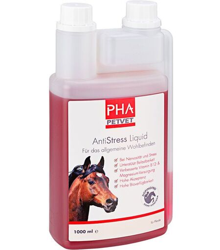PHA AntiStress Liquid Ergänzungsfuttermittel. Flüssiges Ergänzungsfuttermittel für das allgemeine Wohlbefinden sowie bei Nervosität und Stress. PHA AntiStress unterstützt nervöse, unkonzentrierte und hektische Pferde und hilft eine ausgeglichene Entspanntheit wiederzugewinnen. Es unterstützt das Nervensystem für einen schnelleren Abbau von Stresssituationen. Zudem unterstützt es die Leistungsfähigkeit und Leistungsbereitschaft. Bei Nervosität und Stress, unterstützt die Belastbarkeit Verbesserte Vitamin B12- & Magnesiumversorgung Hohe Bioverfügbarkeit ADMR-konform: Im Wettkampf erlaubt Zusammensetzung: Magnesiumchlorid, Calciumchlorid, Traubenzucker Zusatzstoffe: Ernährungsphysiologische Zusatzstoffe: Vitamin B12 als Cyanocobalamin 100.000 mcg, Zink als Zinkchlorid, wasserfrei (3b602) 233 mg, L-Tryptophan (3c440) 1.000 mg Technologische Zusatzstoffe: Natriumpropionat (E281); Zitronensäure (E330) Anwendung: Sie können dieses Futtermittel verwenden, indem Sie je nach Bedarf 35-50 ml je Tier und Tag über das Kraftfutter verfüttern. Dieses Ergänzungsfuttermittel darf wegen des gegenüber Alleinfuttermitteln erhöhten Gehaltes an Zink nur bis zu 50 % der Tagesration verfüttert werden. Nährstoffeintrag aus anderen Futtermitteln berücksichtigen. ...
