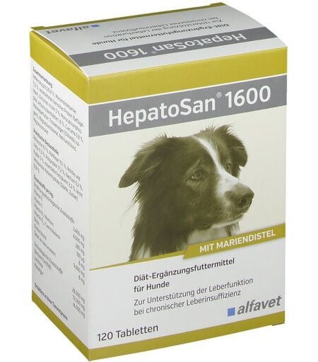 Diätergänzungsfuttermittel zur Unterstützung der Leberfunktion bei chronischer Niereninsuffizienz für Hunde HepatoSan® 1600 liefert der Leber wichtige Nährstoffe wie Vitamine, Mineralstoffe und Cholin, die für die Aufrechterhaltung des Leberstoffwechsels und der Entgiftungsfunk tion der Leber in ausreichender Menge aufgenommen werden müssen. Darüber hinaus enthält HepatoSan® 1600 Mariendistel, Artischocke und Curcuma.Mariendistelsamen, Artischockenblätter undCurcuma ergänzen die Nahrung mit wertvollen sekundären Pflanzenstoffen. Mannanoligosaccharide (Hefeerzeugnis Bio-Mos® 16 %) stärken das Immunsystem.ß-Glucane (Hefeerzeugnis MS-Extra A+ 10,8 %) ermöglichen eine schnelle und effektive Toxinbindung. Cholin dient als Ausgangsstoff für die Synthese von Phosphatidylcholin. Lecithin emulgiert Fette und erleichtert dadurch die Verdauung. Das Präbiotikum Zichorien-Inulin unterstützt die positive Darmflora. Vitamin B2, B12 und Biotin sind an zahl- reichen Stoffwechselprozessen in der Leber beteiligt. Vitamin C, Vitamin E und Selen werden für den Abbau von freien Radikalen benötigt. Zusätzlich enthält HepatoSan® 1600 Bentonit.Zusammensetzung: Hefeerzeugnis 26,8 %, Mariendistelsamen 11,2 %, verarbeitetes tierisches Protein (Geflügelleber), Zichorien-Inulin 5 %, Monocalciumphosphat, Artischockenblätter 1,6 %, Curcuma 0,8 %, Maiskleberfutter, Trockenalgen ( Chlorella vulgaris ), Magnesiumstearat, Natriumchlorid, Magnesiumoxid.Analytische Bestandteile: Rohprotein 17,2 %, Rohöle und -fette 11,3 %, Rohfaser 10,1 %, Rohasche 9,7 %, Natrium 0,2 %, Kupfer 0 %, essentielle Fettsäuren 2,2 %, leicht verdauliche Kohlenhydrate (Stärke, Zucker) 19,9 %,Analytische Bestandteile pro kg: Ernährungsphysiologische Analytische Bestandteile: Vitamin E 2.400 mg, Vitamin C 4.000 mg, Vitamin B2/ Riboflavin280 mg,Vitamin B12/ Cyanocobalamin160 μg,Biotin 8 mg,Cholinchlorid 9.600 mg,Selen als Natriumselenit8 mg.Technologische Analytische Bestandteile: Bentonit [1m558i] 28.000 mg, Lecithine 72.000 mg, Kieselgur 16.000 mg, Fütterungsempfehlung:Jje 10 kg Körpergewicht 1 Tablette täglich. Empfohlene Fütterungsdauer: Zunächst bis zu 6 Monate. Bei Bedarf kann die Fütterungsdauer unbedenklich verlängert werden. Wasser zur freien Aufnahme anbieten. Es wird empfohlen, vor der Verfütterung oder Verlängerung der Fütterungsdauer den Rat eines Tierarztes einzuholen. Dieses Ergänzungsfuttermittel darf wegen des gegenüber Alleinfuttermitteln höheren Gehaltes an Selen nur an Tiere bis zu 5 % der Tagesration verfüttert werden. Hinweis: Die gleichzeitige orale Verabreichung von Malroliden ist zu vermeiden. Nicht über 25 °C lagern. ...