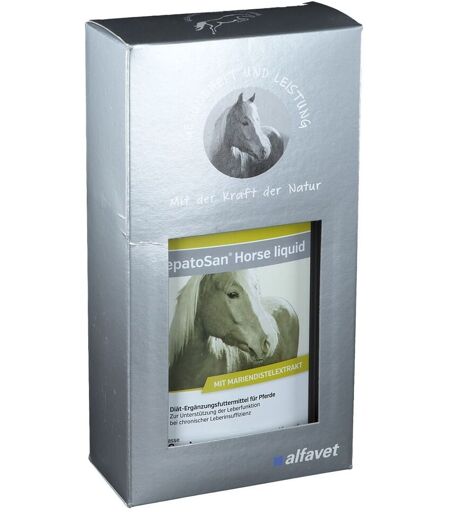 Diätergänzungsfuttermittel zur Unterstützung der Leberfunktion bei chronischer Leberinsuffizienz bei Pferden HepatoSan® Horse liquid liefert wichtige Nährstoffe wie Vitamine, Mineralstoffe, Cholin und Methionin, die insbesondere für die Aufrechterhaltung des Leberstoffwechsels und der Entgiftungsfunktion der Leber in ausreichender Menge aufgenommen werden müssen. Darüber hinaus sind wohltuende natürliche Aromastoffe (Mariendistelextrakt, Artischockenextrakt und Curcumaextrakt) und Bentonit enthalten. Wesentliche ernährungsphysiologische Merkmale: Niedriger Proteingehalt, aber hochwertiges Protein und leicht verdauliche Kohlenhydrate (Zuckerrübensirup). Enthält Bierhefe als Proteinquelle.Schöllkraut ergänzt die Nahrung mit wertvollen sekundären Pflanzenstoffen. Cholin dient als Ausgangsstoff für die Synthese von Phosphatidylcholin. Vitamin B2 und B12 aus der Hefe und Folsäure sind an zahlreichen Stoffwechselprozessen in der Leber beteiligt. DL-Methionin liefert hochbioaktiven Schwefel und wird für die Bildung von S-Adenosyl-Methionin und Phosphatidylcholin benötigt. Zusammensetzung: Zuckerrübensirup, Bierhefe 3 %, Schöllkraut 1 %. Analytische Bestandteile: Rohprotein 6,8 % Rohfaser 0,4 % Rohöle u. -fette 1 % Rohasche 5,9 % Natrium 0,1 % Feuchtigkeit 72,1 %. Analytische Bestandteile pro 1000 ml: Cholinchlorid 50.000 mg DL-Methionin 30.000 mg Folsäure 300 mg Mariendistelextrakt 75 ml Artischockenextrakt 75 ml Curcumaextrakt 75 ml. Technologische Analytische Bestandteile:Bentonit 1m558i 20.000 mg. Fütterungsempfehlung: Zur Verabreichung mit dem Futter oder direkt in das Maul. Pferde 2 x täglich 25 ml. Fohlen, Ponys 2 x täglich 15 ml. Empfohlene Fütterungsdauer: Zunächst bis zu 6 Monate. Bei dauerhafter Fütterung kann die Gabe auf 15 bis 25 ml täglich reduziert werden. Es wird empfohlen, vor der Verfütterung oder der Verlängerung der Fütterungsdauer den Rat eines Tierarztes einzuholen. Hinweis: Die gleichzeitige orale Verabreichung von Makroliden ist zu vermeiden. Vor Gebrauch gut schütteln! Nicht über 25° C und vor Licht geschützt lagern! Nach Anbruch aufbrauchen. Haltbarkeit: 24 Monate ...