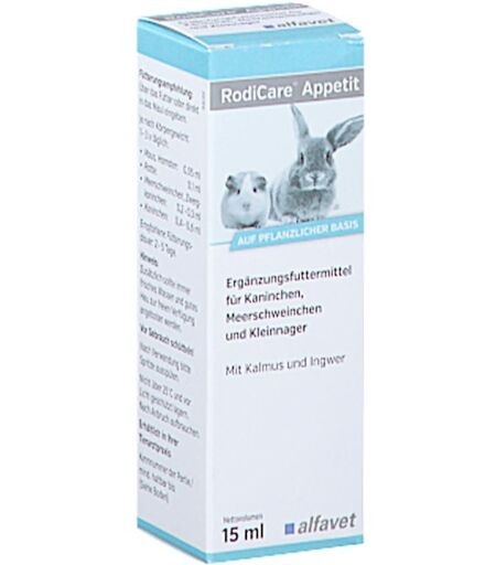 Anwendungsgebiet von Rodicare Appetit für Kaninchen, Meerschweinchen und KleinnagerAppetitlosigkeit bei Kaninchen, Meerschweinchen und Kleinnagern sollte unbedingt ernst genommen werden. Aufgrund ihres schnellen Stoffwechsels können sie schnell in eine Energieunterversorgung geraten, was sich negativ auf die Leberfunktion auswirken kann. Zudem kann schon ein kurzer Zeitraum ohne Nahrungsaufnahme, insbesondere bei Meerschweinchen und Kaninchen, zu Verdauungsproblemen führen, die schwerwiegende Folgen haben können. Daher ist es wichtig, Tiere, die nicht fressen, umgehend einem Tierarzt vorzustellen, um die Ursache der Appetitlosigkeit abzuklären. Rodicare Appetit für Kaninchen, Meerschweinchen und Kleinnager ergänzt die kräuterarme Nahrung mit Kalmus, Enzian, Ingwer und Wermutkraut sowie wohlschmeckenden Aromastoffen (schwarzer Pfefferextrakt) und regt so den Appetit an.Wirkstoffe / Inhaltsstoffe / ZutatenZutaten von Rodicare Appetit für Kaninchen, Meerschweinchen und Kleinnager: Traubenzucker 15 %, [Kalmuswurzel, Wermutkraut, Enzianwurzel, Ingwer], mazeriert je 1,5 %, Kalmuswurzel 0,1 %, Wermutkraut 0,1 %, Enzianwurzel 0,05 %. Analytische Bestandteile: Rohprotein 0 % Rohfaser 1 % Rohfett 1,1 % Rohasche 0,4 % Natrium 0,1 % Feuchtigkeit 86,1 % Zusatzstoffe pro 1000 ml: Aromastoffe: Schwarzer Pfefferextrakt 0,4 ml GegenanzeigenBei bekannter Überempfindlichkeit gegenüber einem der oben genannten Inhaltsstoffe sollte dieses Produkt nicht angewendet werden. DosierungVerzehrempfehlung von Rodicare Appetit für Kaninchen, Meerschweinchen und Kleinnager: Über das Futter oder direkt in das Maul eingeben. Je nach Körpergewicht 1-3 x täglich: Maus, Hamster: 0,05 ml Ratte: 0,1 ml Meerschweinchen, Zwergkaninchen: 0,2-0,3 ml Kaninchen: 0,4-0,6 ml Empfohlene Fütterungsdauer: 2-5 Tage.HinweiseNach Verwendung bitte Spritze ausspülen. Nicht üb ...