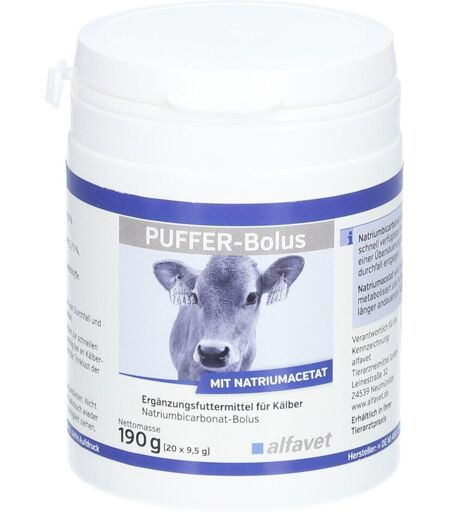 Ergänzungsfuttermittel für Kälber als Natriumbicarbonat-Bolus Alfavet PUFFER-Bolus Der PUFFER-Bolus enthält Puffersubstanzen zur schnellen und anhaltenden Pufferung der Übersäuerung bei an Kälberdurchfall erkrankten Kälbern. Dadurch wird die Trinklust der Kälber gefördert. Natriumbicarbonat wirkt als schnell wirksame Puffersubstanz einer Übersäuerung bei Kälberdurchfall entgegen. Natriumacetat wird zunächst metabolisiert und hat somit eine länger andauernde Pufferwirkung. Zusammensetzung: Natriumbicarbonat 91,9 %, Natriumacetat 2,5 % Analytische Bestandteile: Rohprotein 0% Rohfaser 1,6% Rohfett 1,75% Rohasche 59,1% Natrium 25,9% Zusatzstoffe je kg: Technologische Zusatzstoffe: Natriumpropionat (E 281) 1.000mg Fütterungsempfehlung: 1 PUFFER-Bolus bei den ersten Anzeichen von Durchfall und je 1 Bolus nach den nächsten drei Mahlzeiten. ...