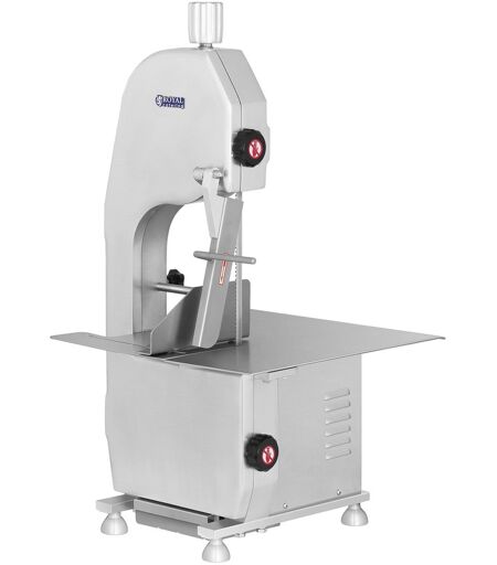 Die elektrische Knochenbandsäge RCBS-1650 trennt mühelos frisches oder gefrorenes Geflügel, Fleisch oder Fisch zu wunschgerechten Portionen. Sie ist dadurch ein leistungsstarker und zuverlässiger Partner bei der Fleischverarbeitung in Ihrem Restaurant, Ihrer Metzgerei oder Fleischerei. Dank ihrer hochwertigen Verarbeitung wird die Knochensäge besonders zuverlässig und langlebig für Sie im Einsatz sein. Das Sägeband aus Edelstahl bietet sehr gute Schnittergebnisse und ist für die Verarbeitung von Lebensmitteln konzipiert. Das Material reagiert nicht auf Feuchtigkeit und verhindert Verunreinigungen, deshalb kann es immer hygienisch einwandfrei eingesetzt werden. Darüber hinaus zeichnet sich das Edelstahl-Sägeblatt durch besondere Langlebigkeit und Stoßfertigkeit aus, sodass es auch harte Fleischstücke zuverlässig schneidet. Für optimale Schnittergebnisse kann die Spannung des 1.650 mm langen Sägeblatts bequem mit einem Drehknopf eingestellt werden, der zur Sicherheit mit einem Begrenzer ausgestattet ist. Die Knochensäge wird sicher mit einem wasserfesten An/Aus-Schalter aktiviert, der für den Einsatz in feuchten Umgebungen mit transparentem Gummi beschichtet ist. Zusätzlich steht Ihnen ein Sicherheitsknopf zur Verfügung, mit dem das Gerät im laufenden Betrieb unverzüglich ausgeschaltet werden kann. Auch sind die Gehäusetüren der Knochensäge doppelt verschlossen, um Unfälle zu vermeiden. Auf der geräumigen Arbeitstischplatte von 440 x 465 mm lässt sich eine Schnittbreite von 3 bis 180 mm mit Hilfe eines Drehknopfs präzise einstellen, die Sie über die eingravierte Skala auf dem Tisch direkt überprüfen können. Dabei ist je nach Breite des Fleischstückes eine maximale Schnitthöhe von 245 mm möglich. Ein bequemer Drücker mit Griff sorgt für eine sichere Handhabung bei der Fleischverarbeitung. Der 750 W starke Motor bewegt das Sägeband der Knochensäge mit einer Geschwindigkeit von 15 m/s. Mit Hilfe der Umlenkrolle wird dabei eine Schnittgeschwindigkeit von 15 m/min erreicht. Dadurch können selbst harte Knochen oder große Rippenteile schnell und mühelos getrennt werden. Während des Betriebs wird das Sägeband mit drei unterschiedlich langen Abstreifern aus Plastik gereinigt. Eine Auffangschale unter dem Arbeitstisch fängt den Ausschuss während des Sägens auf. Sie kann einfach aus dem Gerät genommen und gereinigt werden. Für eine gründliche Reinigung lässt sich das Gerät mühelos auseinanderbauen. Die erstklassige Verarbeitung sämtlicher Geräteteile sowie die hochwertigen Materialien ermöglichen einen dauerhaften Betrieb und eine einfache Wartung der Knochenbandsäge. Das stabile Gehäuse ist aus einer leichten Aluminium-Magnesium-Legierung, die sich durch besondere Langlebigkeit auszeichnet. Für die Kühlung des Motors sorgen Schlitze an der Seite und am Boden des Gehäuses. Die vier Gummifüße sorgen nicht nur für Stabilität, sondern minimieren während des Sägens auch Vibrationen für ein bequemes, ausdauerndes Arbeiten. Die erstklassige Verarbeitung sämtlicher... ...