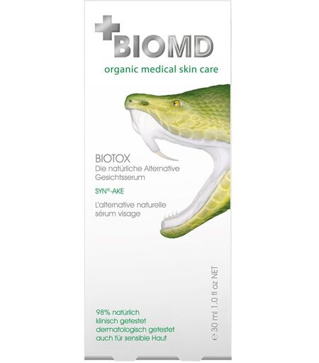 BIOMED Biotox Die Alternative zu Botox Wirkstoffe: Syn®-Ake Wirkung: Nachahmung einer kleinen Sequenz von waglerin1 (paralysierende Wirkung), die im Gift der Bügelviper vorkommt Verringert die neuronale Übertragung von Signalen und verleiht das Erscheinungsbild einer niedrigeren Muskelzellenkontraktion Schnelle Wirkung, Langanhaltend, Komplett abbaubar Anwendung: Tragen Sie zwei Mal täglich BIOTOX auf Ihre Mimikfalten (Stirn, Krähenfüße, Nasolabialfalte, Lippenfätchen) unter Ihre Pflegecreme auf. Zusammensetzung: AQUA, GLYCERIN, DIPEPTIDE DIAMINOBUTYROYL BENZYLAMIDE DIACETATE, XANTHAN GUM, SODIUM BENZOATE, POTASSIUM SORBATE, CITRIC ACID. ...