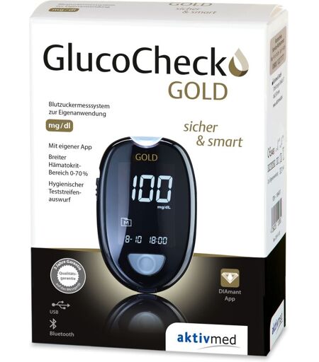 Goldrichtig messen mit dem neuen GlucoCheck GOLD. GlucoCheck GOLD – das Messsystem für alle Zielgruppen. Es verbindet aktivmeds jahrelange Erfahrung mit der innovativen 2 + 2-Technologie, die genaue Messergebnisse ermöglicht. Durch die 1-Tasten-Bedienung und einen extra breiten Teststreifen ist das Gerät sowohl sicher als auch handlich in der Bedienung. Das Messgerät der neuen Generation ist messgenauer als es die neue DIN EN ISO 15197:2015 verlangt: Breiter Hämatokrit-Bereich: 0 - 70 % 2 + 2-Technologie Blutmenge: ≤ 0,5 µl Messdauer: nur 5 Sekunden Kein Kodieren notwendig Beleuchteter Teststreifeneinschub Teststreifenauswurf-Taste DIN EN ISO 15197:2015 erfüllt Einfache Datenübertragung per Bluetooth und USB Tagebuch-Funktion über App und PC-Software Kostenloser Batterieaustausch-Service Großes LCD mit Hintergrundbeleuchtung ...