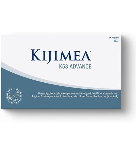 Nahrungsergänzungsmittel sind kein Ersatz für eine abwechslungsreiche und ausgewogene Ernährung und eine gesunde Lebensweise.Kijimea® K53 Advance – das Multibiotikum für die tägliche AnwendungDas Darmmikrobiom ist ein komplexes und vielfältiges Ökosystem. Darunter versteht man die Gemeinschaft der im Darm lebenden Mikroorganismen. Ganz entscheidend sind dabei eine hohe Vielfalt und Vielzahl der im Darm angesiedelten Bakterienstämme.Kijimea® K53 Advance enthält eine einzigartige Komposition aus 53 aufeinander abgestimmten Bakterienstämmen, die den Darm besiedeln können. Damit imitiert Kijimea K53 Advance das natürliche Darmmikrobiom in seiner Vielfalt. Zudem enthält Kijimea® K53 Advance zusätzlich Vitamin B3 und B7, die zur Erhaltung normaler Schleimhäute beitragen. Zutaten: Maisstärke, Kapselhülle: Hydroxypropylmethylcellulose; Mikrokulturenmischung (Mikrokulturenstämme, Maisstärke; enthält Milch und daraus gewonnene Erzeugnisse (Milcheiweiß)), Trennmittel: Magnesiumsalze der Speisefettsäuren; Niacin, Biotin, Trennmittel: Siliciumdioxid; Farbstoffe: Eisenoxidschwarz, Brillantschwarz PN.Nährwerte: Zusammensetzung pro 1 Kapsel Vitamin B7 (Biotin) 50 µg Vitamin B3 (Niacin) 0,8 mg Mikokulturen 0,2 x 1011 VerzehrempfehlungFür Erwachsene und Kinder ab 4 Jahren: 1 x täglich 1 Kapsel unzerkaut mit ausreichend Flüssigkeit zu einer Mahlzeit (morgens, mittags oder abends) verzehren. Da bei kleineren Kindern Erstickungsgefahr durch Verschlucken besteht, sollte die Kapsel geöffnet und der Inhalt mit etwas Flüssigkeit verzehrt werden.Nebenwirkungen Es sind keine Nebenwirkungen beim Verzehr von Kijimea® K53 Advance bekannt.Verträglichkeit Kijimea® K53 Advance ist gluten-, fruktose- und laktosefrei, frei von Konservierungs- und Aromastoffen sowie frei von Süßungsmitteln. Das Produkt sollte nicht verzehrt werden, wenn Sie allergisch gegen einen der Inhaltsstoffe sind.Lagerungsempfehlung Kijimea® K53 Advance sollte trocken und unter 25 °C aufbewahrt werden. Außerhalb der Reichweite von kleinen Kindern lagern.Wichtige Hinweise Die angegebene empfohlene tägliche Verzehrsmenge darf nicht überschritten werden. Nahrungsergänzungsmittel sind kein Ersatz für eine ausgewogene, abwechslungsreiche Ernährung und eine gesunde Lebensweise.Hersteller: Synformulas GmbH Am Haag 14 82166 Gräfelfing Deutschland Tel. DE: +49 (0) 89 / 7879790-100 Fax DE: -58 Tel. AT: +43 (0) 720 / 7754-04www.kijimea.de www.kijimea.at ...