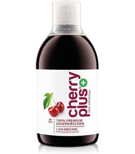 Nahrungsergänzungsmittel sind kein Ersatz für eine ausgewogene und abwechslungsreiche Ernährung und eine gesunde Lebensweise.Cherry PLUS Konzentrat kombiniert die natürliche Kraft der Montmorency-Sauerkirsche mit höchster Qualität. Durch die schonende Herstellung bleiben die wertvollen Pflanzenstoffe erhalten. Diese einzigartige Mischung aus Antioxidantien und Vitalstoffen ist ideal, um die tägliche Gesundheit zu fördern.Die Besonderheiten von Cherry PLUS Eine tägliche Verzehrmenge von 30 ml entspricht der Kraft von 90 naturbelassenen Sauerkirschen, gewonnen aus insgesamt 1.450 Kirschen pro Flasche. Das stärkste Montmorency-Sauerkirsch-Konzentrat, das auf dem Markt erhältlich ist. Originale US-Montmorency-Sauerkirschen (Prunus cerasus) aus der Region Michigan. Enthält wertvolle sekundäre Pflanzenstoffe (Anthocyane, Flavonoide, Polyphenole) in einer bioaktiven Pflanzenstoffmatrix. Schonende Herstellung durch Niedrigtemperaturverfahren, um die Inhaltsstoffe bestmöglich zu erhalten. Qualitätskontrollen bei jeder Ernte sorgen für gleichbleibende Qualität. Produktion unter pharmazeutischen Bedingungen in Deutschland. Vegan, ohne künstliche Zusatzstoffe. Kaltabfüllung ohne Erhitzung, frei von Weichmachern.Power durch Pflanzenstoffe & Antioxidantien Mit dem Inhalt von 1.450 Montmorency-Sauerkirschen pro 500 ml-Flasche ist Cherry PLUS das stärkste Montmorency-Sauerkirsch-Konzentrat und die Nr. 1 in Apotheken. Jede Portion enthält die geballte Pflanzenkraft von 90 naturbelassenen Kirschen, reich an Vitalstoffen, Antioxidantien und natürlichem Melatonin, um Sie bestmöglich zu unterstützen. Hochwertige Verarbeitung für bestmögliche Ergebnisse Unser Konzentrat wird durch ein speziell entwickeltes Niedrigtemperaturverfahren hergestellt, um die wertvollen Inhaltsstoffe der Montmorency-Sauerkirsche zu bewahren. Die Kirschen werden im optimalen Reifestadium in Michigan (USA) geerntet und dann in Deutschland unter strengen pharmazeutischen Standards verarbeitet. Ihr natürlicher Begleiter für mehr Gesundheit Cherry PLUS hebt sich dank seiner hohen Konzentration und natürlichen Darreichungsform von anderen Produkten ab. Es ist der perfekte Begleiter für Ihre gesundheitlichen Ziele und unterstützt Sie als zuverlässiger Therapiebegleiter. Was Cherry PLUS zum Marktführer macht Cherry PLUS überzeugt durch seine hohe Konzentration und die wertvollen Vitalstoffe. Die Montmorency-Sauerkirsche ist für ihren hohen Gehalt an sekundären Pflanzenstoffen bekannt, die als Antioxidantien wirken und Cherry PLUS zum idealen Produkt für eine purinarme Ernährung machen. Zutaten:100% Montmorency-Sauerkirsch-Konzentrat Zusammensetzung pro 100 ml pro Dosierkappe(= 30 ml) Brennwert 1537 kJ / 367 kcal 460 kJ / 110 kcal Fett 0 g 0 g davon gesättigte Fettsäuren 0 g 0 g Kohlenhydrate 83,3 g 25 g davon Zucker 63,3 g 19 g Ballaststoffe 0 g 0 g Eiweiß 3,3 g 1 g Salz < 0,1 g < 0,003 g Verzehrempfehlung:Täglich bis zu einer Dosierkappe (30ml) Cherry PLUS in 250 ml Wasser oder Saft einrühren.... ...