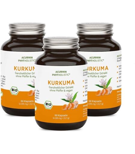 Nahrungsergänzungsmittel sind kein Ersatz für eine ausgewogene und abwechslungsreiche Ernährung und eine gesunde Lebensweise. Acurmin Phytholistic BIO Kurkuma Kapseln Natürliche Bio Kurkuma Kapseln mit 300 mg Curcuminoiden und 255 mg Curcumin pro Tagesdosis. Nur 2 Kapseln täglich entsprechen 23 g frischem Curcuma longa. Mit der 3-fach-Innovation bietet Acurmin Phytholistic ein Kurkuma ohne Pfeffer / Piperin mit gleichzeitig 40-facher Bioverfügbarkeit und liefert als erstes Vollspektrum-Kurkuma zusätzlich über 235 sekundäre Pflanzenstoffe. Unter anderem wertvolle Kurkuma-Proteine, Kurkuma-Ballaststoffe, Ätherische Öle, Curcumin und viele mehr. Die Herstellung der veganen Kurkuma Kapseln erfolgt ausschließlich in Deutschland. Jede Charge wird mit dem C14-Prüfverfahren auf seine natürliche Reinheit geprüft, um ein Bio-Kurkuma-Produkt anbieten zu können, das frei von synthetischen Füll- und Hilfsstoffen ist. 300 mg Curcuminoide und 255 mg Curcumin pro Tagesdosis (2 Kapseln) - Curcumingehalt pro Kurkuma-Kapsel entspricht rund 23 g frischem Curcuma longa! 40-fach gesteigerte Bioverfügbarkeit ohne Pfeffer / Piperin oder sonstige Verstärker Erstes Vollspektrum-Kurkuma mit über 235 konzentrierten Kurkuma-Pflanzenstoffe Reines Bio-Kurkuma und Curcumin – C14 geprüft Hergestellt in Deutschland unter pharmazeutischer Qualität in Zusammenarbeit mit der Oncotrition GmbH Einzigartige Verarbeitung und Herstellung und Verpackung im dunklen Apothekerglas für höchste Frische und Qualität Rohstoff ist von der DE-ÖKO-006-Kontrollstelle geprüft Zutaten: Bio-Kurkuma-Pulver, Bio-Kurkuma-Extrakte, Überzugsmittel (Kapselhülle): Hydroxypropylmethylcellulose (pflanzlich) Verzehrempfehlung: 2 Kapseln täglich vor einer Mahlzeit mit genügend Flüssigkeit einnehmen. Hinweis: (Bsp. Nicht während der Schwangerschaft oder Stillzeit einnehmen) Lagerhinweis: Kühl, trocken und lichtgeschützt sowie außerhalb der Reichweite von kleinen Kindern lagern. Mindesthaltbarkeitsdatum: Siehe Faltschachtel. Nettofüllmenge: 3 x 60 Kapseln (180 Stück) Hersteller: Cellavent Healthcare GmbH Am Trippelsberg 43 40589 Düsseldorf ...