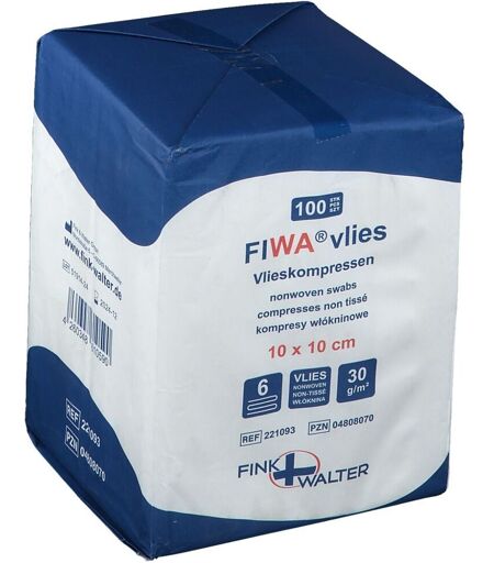 FIWA® vlies Vliesompressen 10 x 10 cm unsteril Vliesstoff-Kompressen (30 g/m2 )aus 70% Zellwolle und 30% Polyesterfasern offene, mullähnliche Struktursehr saugfähig, weich und luftdurchlässigZur allgemeinen Wundversorgung, insbesondere zur Erstversorgung von verschmutzten, infizierten und sezernierenden Wunden, als Tupfer und als Kompressen bei kleineren operativen Eingriffen in der Ambulanz oder auf der Station zur äußeren Anwendung einsetzbar, vor dem Kontakt mit offenen Wunden muss der Artikel mit einem validierten Verfahren sterilisiert werden ...