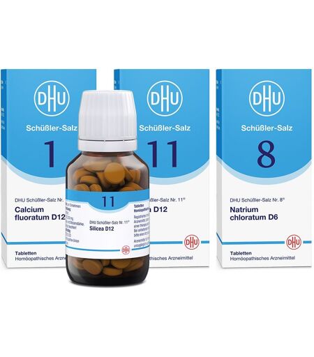 Set-Inhalt: 3 x 200 Tabletten (BIOCHEMIE 1, 8 & 11) Biochemie 1 Calcium fluoratum D 12 Inhaltstoffe Biochemie 1 Calcium fluoratum D 12, 1 St:Calcium fluoratum (hom./anthr.) - 250 mgDas Salz des Bindegewebes, der Gelenke und HautCalcium fluoratum ist wichtig für das Stütz- und Bindegewebe. Es verleiht dem Bindegewebe Festigkeit. Vorkommen im Körper: Calcium fluoratum ist im Zahnschmelz, den Knochen und den Zellen der obersten Hautschicht enthalten. Darüber hinaus kommt es insbesondere im elastischen Gewebe wie z. B. in den Sehnen und Bändern vor.Tipp:Das Dr. Schüßler Salz Nr. 1 lässt sich besonders gut mit der Nr. 11 kombinieren. Mit diesen beiden Dr. Schüßler Salzen tun Sie etwas für schöne Haut, Haare und Nägel.So wird's gemacht:Dosierung und AnwendungGrundsätzlich gelten die Angaben der Packungsbeilage, liegt diese nicht vor, gilt derzeit folgende Empfehlung als Richtschnur:Erwachsene: Schüßler-Salz Nr.1 Calcium fluoratum D12: Morgens: 2 Tabletten im Mund zergehen lassen Schüßler-Salz Nr.8 Natrium chloratum D6: Mittags: 2 Tabletten im Mund zergehen lassen Schüßler-Salz Nr.11 Silicea D12: Abends: 2 Tabletten im Mund zergehen lassen Kinder:Säuglinge bis zum 1. Lebensjahr erhalten, nach Rücksprache mit einem Arzt, nicht mehr als ein Drittel der Erwachsenendosis. Kleinkinder bis zum 6. Lebensjahr erhalten nicht mehr als die Hälfte, Kinder zwischen dem 6. und 12. Lebensjahr erhalten nicht mehr als zwei Drittel der Erwachsenendosis. Bitte beachten Sie auch die Gebrauchsinformation.Wichtig: Tabletten im Mund zergehen lassen Sie sollten die Tabletten eine halbe Stunde vor oder nach dem Essen einnehmen und sie vorzugsweise langsam im Mund zergehen lassen. So können die Arzneistoffe ohne Umwege direkt über die Mundschleimhaut aufgenommen werden. Bei kleinen Kindern empfiehlt es sich, die Tablette vor der Einnahme in etwas Wasser aufzulösen.Ein spezieller Tipp: Manche mögen 's heißUnd das ganz besonders mit dem Mineralsalz Nr.7, Magnesium phosphoricum. Hier hat sich eine andere Anwendungsweise bewährt, die besonders schnell und intensiv wirkt: die sogenannte Heiße Sieben. Hierzu lösen Sie zehn Magnesium phosphoricum Tabletten in heißem Wasser auf. Anschließend trinken Sie die Lösung möglichst warm und in kleinen Schlucken. Zwar hat sich diese Einnahmeweise speziell bei der Nr.7 bewährt, aber auch die anderen Salze können durchaus auf diese Weise verabreicht werden.Dr. Schüßler Salze DHU – höchste Qualität für Ihre GesundheitDie Deutsche Homöopathie-Union (DHU) ist Deutschlands führender Anbieter von Schüßler-Salzen*. Die Dr. Schüßler Salze DHU bieten eine konstant hohe Qualität, der Sie jederzeit vertrauen können.Tradition seit 1873Die Tradition in der Herstellung der Dr. Schüßler Salze DHU reicht bis ins Jahr 1873 zurück. Vertrauen auch Sie auf unsere hohen Anforderungen an die Qualität unserer Produkte: Dr. Schüßler Salze Original DHU – als Tabletten, Salben und Lotionen – nur das Beste für Ihre Gesundheit. Die 12 Salze des Lebens Biochemische... ...