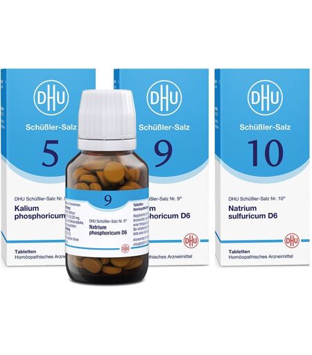 Gesund in Form - Sie möchten überall eine gute Figur machen? Achten Sie auch auf einen ausgewogenen Mineralstoffhaushalt. DHU Schüßler-Salze Nr. 5 + 9 + 10 als Tabletten. Morgens: Nr. 10 – Salz der inneren ReinigungNatrium sulfuricum wird auch als das Ausleitungsmittel unter den Mineralsalzen bezeichnet. Es wirkt auf die Ausscheidungsorgane (Leber, Galle, Niere) und hilft dem Körper, überschüssiges Wasser auszuscheiden. Vorkommen im Körper:Natrium sulfuricum ist vorwiegend in der Gewebeflüssigkeit enthalten.Mittags: Nr. 5 – Salz der Nerven und PsycheKalium phosphoricum gilt als Nährstoff für die Nerven. Vorkommen im Körper:Kalium phosphoricum ist das bedeutendste anorganische Salz der Zellen und ist besonders für die Blutflüssigkeit, die Gehirn-, Nerven- und Muskelzellen wichtig.Abends: Nr. 9 – Salz des StoffwechselsNatrium phosphoricum dient zur Aufrechterhaltung des Säure-Basen-Gleichgewichts im Körper und regt den Stoffwechsel an. Vorkommen im Körper:Natrium phosphoricum ist im menschlichen Körper weitverbreitet: Es kommt in den Gehirnzellen, Nerven, Muskeln, roten Blutkörperchen und im Bindegewebe vor. Dosierung und AnwendungGrundsätzlich gelten die Angaben der Packungsbeilage, liegt diese nicht vor, gilt derzeit folgende Empfehlung als Richtschnur: Erwachsene: Schüßler-Salz Nr.10 Natrium sulfuricum D6: Morgens: 2 Tabletten im Mund zergehen lassen Schüßler-Salz Nr.5 Kalium phosphoricum D6: Mittags: 2 Tabletten im Mund zergehen lassen Schüßler-Salz Nr.9 Natrium phosphoricum D6: Abends: 2 Tabletten im Mund zergehen lassen Anwendungsdauer: 4-6 Wochen (bei Bedarf nach 1-wöchiger Pause wiederholen) Kinder:Säuglinge bis zum 1. Lebensjahr erhalten, nach Rücksprache mit einem Arzt, nicht mehr als ein Drittel der Erwachsenendosis. Kleinkinder bis zum 6. Lebensjahr erhalten nicht mehr als die Hälfte, Kinder zwischen dem 6. und 12. Lebensjahr erhalten nicht mehr als zwei Drittel der Erwachsenendosis. Bitte beachten Sie auch die Gebrauchsinformation. Wichtig: Tabletten im Mund zergehen lassen. Sie sollten die Tabletten eine halbe Stunde vor oder nach dem Essen einnehmen und sie vorzugsweise langsam im Mund zergehen lassen. So können die Arzneistoffe ohne Umwege direkt über die Mundschleimhaut aufgenommen werden. Bei kleinen Kindern empfiehlt es sich, die Tablette vor der Einnahme in etwas Wasser aufzulösen. Dr. Schüßler Salze DHU – höchste Qualität für Ihre GesundheitDie Deutsche Homöopathie-Union (DHU) ist Deutschlands führender Anbieter von Schüßler-Salzen*. Die Dr. Schüßler Salze DHU bieten eine konstant hohe Qualität, der Sie jederzeit vertrauen können. Tradition seit 1873Die Tradition in der Herstellung der Dr. Schüßler Salze DHU reicht bis ins Jahr 1873 zurück. Vertrauen auch Sie auf unsere hohen Anforderungen an die Qualität unserer Produkte: Dr. Schüßler Salze Original DHU – als Tabletten, Salben und Lotionen – nur das Beste für Ihre Gesundheit. Die 12 Salze des Lebens Biochemische Funktionsmittel Nr. 1–12 Calcium fluoratum D3 [D6, D12]... ...