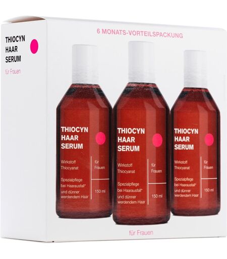 Thiocyn Haarserum Frauen Vegan mit dem körpereigenen Molekül Thiocyanat stärkt die Haarwurzel und schützt sie gegenüber wachstumsstörenden Einflüssen. Die wissenschaftlich fundierte² Spezialpflege mit der patentierten Thiocyanat-Wirkformel ist deshalb zur Vorbeugung und Pflege bei Haarausfall*, lichtem oder dünner werdendem Haar geeignet. Thiocyn Haarserum Frauen Vegan überzeugt durch eine sehr gute Verträglichkeit¹ , ist auf die geschlechtsspezifischen Pflegebedürfnisse von Frauen optimiert und ist frei von Nebenwirkungen.