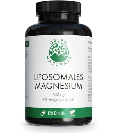 Nahrungsergänzungsmittel sind kein Ersatz für eine ausgewogene und abwechslungsreiche Ernährung und eine gesunde Lebensweise. Liposomales Magnesium mit bester Bioverfügbarkeit 100 % vegan – Aus rein pflanzlichen Inhaltsstoffen Magnesium unterstützt die normale Muskelfunktion Magnesium ist ein Mineral mit zentraler Bedeutung für verschiedene Körperfunktionen. Ein ausgewogener Magnesiumhaushalt ist eine entscheidende Voraussetzung für das Wohlbefinden, die Ausgeglichenheit und die Leistungsfähigkeit. Besondere Alltagsherausforderungen wie Stresssituationen oder vermehrte körperliche und geistige Belastung erhöhen den Magnesiumbedarf. Die tägliche Unterstützung für Muskeln und Nerven Magnesium spielt eine zentrale Rolle für unsere Gesundheit. Der Mineralstoff ist an mehr als 300 biochemischen Reaktionen im Körper beteiligt. Zahlreiche essenzielle Körperfunktionen sind auf eine ausreichende Versorgung mit Magnesium angewiesen. Besonders ältere Menschen, Leistungssportler und Personen, die schwere körperliche Arbeit verrichten, sollten auf eine ausreichende Magnesiumversorgung achten.Magnesium trägt unter anderem zu einem normalen Energiestoffwechsel bei zur normalen psychischen Funktion bei zur Verringerung von Müdigkeit und Ermüdung bei zu einer normalen Muskelfunktion bei zur Erhaltung normaler Knochen bei zur Erhaltung normaler Zähne bei zu einer normalen Funktion des Nervensystems beiBei unausgewogener und einseitiger Ernährung kann es zu einer Unterversorgung von Magnesium kommen. Green Naturals Liposomales Magnesium trägt zur täglichen Versorgung mit Magnesium bei. Symptome eines Magnesiummangels Ein Magnesiummangel macht sich durch verschiedene Beschwerden bemerkbar. Eine chronische Unterversorgung mit dem Mineralstoff zeigt sich vor allem durch Symptome wie Kopfschmerzen, Müdigkeit sowie Muskelkrämpfe. Weitere mögliche Anzeichen für einen Magnesiummangel sind Muskelzuckungen, eine verringerte Stresstoleranz und abnehmende Belastungsfähigkeit. Was ist das Besondere an Green Naturals Liposomales Magnesium? Da viele Magnesium-Präparate eine schlechte Bioverfügbarkeit aufweisen, haben wir für unser Magnesium eine spezielle Verkapselung mit Liposomen ausgewählt. Diese Verkapselung ermöglicht, dass die Magnesium-Moleküle unbeschadet durch den Körper an ihren Zielort gelangen und so vom Organismus optimal verwertet werden können.Green Naturals liegt die Qualität unserer Produkte sehr am Herzen und dies möchten wir auch unseren Kunden vermitteln. Aus diesem Grund sind wir transparent was die Herkunft unserer Produkte betrifft. All unsere Produkte werden in sorgfältig und streng geprüften Anlagen in Deutschland hergestellt und unterliegen den höchsten Qualitätsstandards. Bei der Entwicklung unserer Produkte achten wir vor allem auf deren Verträglichkeit und Bioverfügbarkeit.Zutaten:Magnesiumcitrat, Maltodextrin, Feuchthaltemittel (Glycerin), Verdickungsmittel (Sonnenblumenlecithine), Kapselhülle: Überzugsmittel... ...