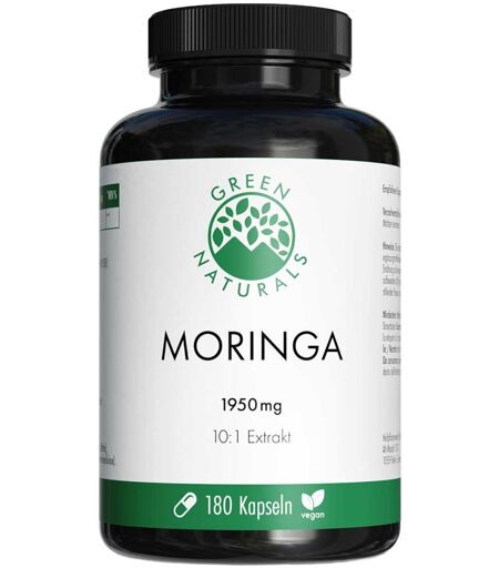 Anwendungsgebiet von Green Naturals® Moringa 1.950 mg hochdosiert Kapseln vegan Green Naturals® Moringa 1.950 mg hochdosiert Kapseln vegan: Kraft der NaturMoringa, oft als „Wunderbaum“ bezeichnet, ist eine Pflanze, die seit jeher in verschiedenen Kulturen rund um den Globus verwendet wirdViele Menschen integrieren Moringa als wertvolle Ergänzung in ihre bewusste Ernährungsweise Traditionell bewährtDie Nutzung von Moringa reicht weit zurück – von Asien über Afrika bis nach Südamerika wurde die Pflanze traditionell vielseitig eingesetztHeute findet Moringa seinen Platz in modernen Ernährungskonzepten und wird aufgrund seiner Vielseitigkeit geschätzt Premiumqualität aus DeutschlandUnsere Moringa-Kapseln liefern dir 1.950 mg Moringa-Extrakt pro Tagesdosis (3 Kapseln) – hergestellt aus einem hochwertigen 10:1 ExtraktDie Kapseln sind vegan, glutenfrei und frei von unnötigen ZusatzstoffenAbgefüllt und laborgeprüft in Deutschland – für höchste Ansprüche an Qualität, Reinheit und SicherheitWirkstoffe / Inhaltsstoffe / ZutatenZutaten von Green Naturals® Moringa 1.950 mg hochdosiert Kapseln vegan:Moringa-Extrakt (Moringa Oleifera, Blätter), Kapselhülle: Überzugsmittel (Hydroxypropylmethylcellulose).GegenanzeigenBei bekannter Überempfindlichkeit gegenüber einen der oben genannten Inhaltsstoffe sollte dieses Produkt nicht angewendet werden.DosierungVerzehrempfehlung von Green Naturals® Moringa 1.950 mg hochdosiert Kapseln vegan:3 Kapseln täglich mit ausreichend Flüssigkeit zu einer Mahlzeit einnehmen.HinweiseNahrungsergänzungsmittel stellen keinen Ersatz für eine abwechslungsreiche Ernährung dar. Eine ausgewogene Ernährung und gesunde Lebensweise sind wichtig. Die empfohlene tägliche Verzehrmenge sollte nicht überschritten werden. Außerhalb der Reichweite von kleinen Kindern aufbewahren. Kühl und trocken lagern. Green Naturals® Moringa 1.950 mg hochdosiert Kapseln vegan können in Ihrer Versandapotheke www.j ...