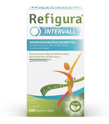 Sollte nicht konsumiert werden, wenn Sie am selben Tag andere Produkte konsumieren, die grünen Tee enthalten. Sollte nicht von schwangeren oder stillenden Frauen und Kindern unter 18 Jahren konsumiert werden.Sollte nicht auf nüchternen Magen konsumiert werdenNahrungsergänzungsmittel sind kein Ersatz für eine ausgewogene und abwechslungsreiche Ernährung und eine gesunde Lebensweise. Refigura® Intervall Kapseln Ideale Unterstützung beim Intervallfasten Refigura Intervall unterstützt mit seinen natürlichen Inhaltstoffen die positiven Effekte des Intervallfastens und vereinfacht die gewünschte Gewichtsreduktion spürbar: Spezial-Extrakt aus der Konjakpflanze (Amorphophallus rivieri) sorgt für ein langanhaltendes Sättigungsgefühl 1,2 Zink, Kupfer und Grüntee-Konzentrat fördern den Energie- und Fettstoffwechsel 3,4 Hochdosierter Ingwer Extrakt unterstützt beim Entschlacken 100% vegan und ohne Allergene 5 Glutenfrei, Laktosefrei, Sojafrei, ohne Süßungsmittel und ohne Konservierungsstoffe. Warum Intervallfasten funktioniert Am bekanntesten ist die 16-8-Intervall-Methode: 16 Stunden lang wird auf Nahrungszufuhr verzichtet, dann aber darf über einen Zeitraum von 8 Stunden ganz normal gegessen und genossen werden. Der Vorteil: Der Stoffwechsel wird nicht gedrosselt, die Muskelmasse nicht abgebaut. Dadurch wird der gefürchtete Jo-Jo-Effekt herkömmlicher Fastenmethoden vermieden. Intervallfastende bleiben so dauerhaft schlank! Erfolgreicher Intervallfasten mit Refigura Die Wirksamkeit der Inhaltsstoffe wurden von der Europäische Oberbehörde (EFSA) geprüft und offiziell bestätigt: Abnehmen: Glucomannan trägt im Rahmen einer kalorienarmen Ernährung zu Gewichtsverlust bei Stoffwechsel: Zink trägt zu einem normalen Kohlenhydratstoffwechsel und zu einem normalen Fettsäurestoffwechsel bei und Kupfer trägt zu einem normalen Energiestoffwechsel Energie: Kupfer trägt zu einem normalen Energiestoffwechsel bei Blutzucker: Chrom trägt zur Aufrechterhaltung eines normalen Blutzuckerspiegels bei Bindegewebe: Kupfer trägt zur Erhaltung von normalem Bindegewebe bei Zutaten: Glucomannanreicher Konjak-Wurzel Extrakt, Hydroxypropylmethylcellulose (Kapselhülle), Kartoffelstärke, Grüntee Extrakt, Ingwer Pulver, Zinkcitrat, Chrompicolinat, Kupfercitrat. Nährwerte: Durschnittliche Nährwerte: pro 6 Kapseln (Tagesdosis) NRV%* Zink 1,5 mg 15 % Kupfer 150 µg 15 % Chrom 12 µg 30 % Konjak-Wurzel Extrakt -davon Glucomannan 3,2 g 3 g ** Grüntee Extrakt -davon Polyphenole 333 mg 199, 5 mg ** Ingwer Pulver 210 mg ** *Nährstoffbezugswerte/nutrient reference values ** LMIV Empfehlung nicht festgelegt Verzehrempfehlung: Refigura Intervall wird oral (über den Mund) eingenommen. Täglich 3 x 2 Kapseln mit viel Wasser einnehmen. Um eine positive Wirkung im Rahmen einer kalorienarmen Ernährung zu erzielen, nehmen Sie 3-Mal täglich je 2 Kapseln ein (= 3 g Glucomannan), ca. 15 Minuten vor jeder Mahlzeit. Nach der Einnahme 1-2 Gläser Wasser trinken, damit das Glucomannan in den Magen gelangen kann.... ...