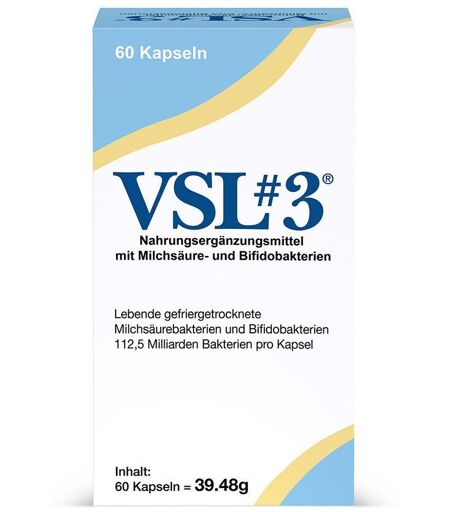 Nahrungsergänzungsmittel sind kein Ersatz für eine ausgewogene und abwechslungsreiche Ernährung und eine gesunde Lebensweise.VSL3 Kapseln – Hochdosierte Milchsäure- & BifidobakterienVSL#3 Kapseln sind ein hochwertiges Probiotikum mit einer einzigartigen Mischung aus hochdosierten Milchsäure- und Bifidobakterien. Sie unterstützen die Darmflora, fördern das Gleichgewicht des Mikrobioms und tragen zur allgemeinen Verdauungsgesundheit bei.Zutaten: Mischung aus Milchsäurebakterien und Bifidobakterien*, Hydroxylpropylmethylcellulose (HPMC pflanzliche Kapsel), Maisstärke, Trennmittel (Magnesiumstearat, Siliziumdioxid und Stearinsäure), mikrokristalline Cellulose. *Jede Kapsel enthält eine Mischung aus 112,5 Milliarden Bakterien, darunter: S. thermophilus BT01, B. breve BB02, B. animalis subsp. lactis BBL03 (früher als B. longum bezeichnet), B. animalis subsp. lactis BI04 (früher als B. infantis bezeichnet), L. acidophilus BA05, L. plantarum BP06, L. paracasei BP07, L. helveticus BD08 (früher als L. delbrueckii subsp. bulgaricus bezeichnet). Verzehrempfehlung: Für Erwachsene und Jugendliche, 1 bis 2 Kapseln täglich einnehmen.Aufbewahrungs- & Verwendungshinweis: Im Kühlschrank bei (2-8°C) aufbewahren. Das Produkt kann bei Raumtemperatur (bis zu 25°C) bis zu 7 Tage lang aufbewahrt werden, ohne dass die Wirksamkeit beeinträchtigt wird. Die empfohlene Tagesdosis darf nicht überschritten werden. Nahrungsergänzungsmittel sollten nicht als Ersatz für eine ausgewogene und abwechslungsreiche Ernährung und eine gesunde Lebensweise verwendet werden. Nicht verwenden, wenn die Kapsel zerbrochen oder beschädigt ist. Für kleine Kinder unzugänglich aufbewahren.Nettofüllmenge: 60 Kapseln = 39,48gHestellerdaten:Heilpflanzenwohl GmbH ...