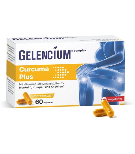 GELENCIUM® Curcuma Plus hochdosiert mit Vitamin C EXTRA-Hochdosierter Curcuma-Extrakt mit Hagebutte und Mikronährstoffen für gesunde Gelenke (1), Knorpel (2), Knochen (3) & Muskeln (4) EXTRA-HOCHDOSIERTER CURCUMA-EXTRAKT MIT 95% CURCUMINOIDEN MIT NATÜRLICHEM BIOVERFÜGBARKEITSBOOSTER HAGEBUTTE MAGENSCHONEND – OHNE PIPERIN GELENCIUM® Curcuma Plus ist die Curcuma-Innovation mit EXTRA-hochdosiertem Curcuma (95% Curcuminoide) und dem natürlichen Bioverfügbarkeits-BOOSTER Hagebutte. Die einzigartige Vereinigung dieser beiden Super-Antioxidantien steigert die Bioverfügbarkeit der wertvollen Curcuminoide nachweislich. Eine hohe Wirkstoff-Aufnahme ist auf natürliche Weise gesichert - ganz ohne Wirkverstärker, die sich reizend auf den Magen auswirken können. GELENCIUM® Curcuma Plus wird abgerundet durch eine Kombination aus optimal dosierten Vitaminen und Mineralstoffen, die die Gelenkgesundheit unterstützen: Vitamin C, Vitamin D, Magnesium und Calcium. Ein Mikronährstoffkomplex, der die Gelenkfunktion unterstützt: „Gesunde Gelenke“: GELENCIUM® Curcuma Plus enthält Vitamin C, Vitamin D, Magnesium und Calcium zur Unterstützung der normalen Knorpel-, Knochen- und Muskelfunktion. Knorpel: Vitamin C trägt zu einer normalen Kollagenbildung für eine normale Knorpelfunktion bei. Knochen: Vitamin D, Vitamin K, Magnesium, Mangan, Zink und Calcium tragen zur Erhaltung normaler Knochen bei. Vitamin C trägt zu einer normalen Kollagenbildung für eine normale Funktion der Knochen bei. Muskeln: Calcium, Magnesium und Vitamin D tragen zu einer normalen Muskelfunktion bei. Zellschutz: Kupfer, Mangan und Vitamin C trägt dazu bei, die Zellen vor oxidativem Stress zu schützen. Müdigkeit: Magnesium und Vitamin C tragen zur Verringerung von Müdigkeit und Ermüdung bei. Curcuma & Hagebutte – Eine einzigartige Kombination Curcuma und Hagebutte vereinen sich in GELENCIUM® Curcuma Plus zu einer kraftvollen Synergie. Der EXTRA-hochdosierte Curcuma-Extrakt liefert 95 % Curcuminoide, darunter 70 % Curcumin. Hagebutte bietet einen hohen Vitamin C Gehalt und ist zudem ein Katalysator bei der Aufnahme von Curcuminoiden. Curcuma – EXTRA-hochdosierter Extrakt 95% Curcuminoide, 70% Curcumin Hochwertiger Extrakt aus Curcuma longa L. Natürliches Super-Antioxidans Studien haben belegt: Der Grund für das große gesundheitliche Potenzial der goldenen Wurzel sind die biologisch aktiven Curcuminoide. Das moderne Curcuma-Präparat GELENCIUM® Curcuma Plus enthält einen reinen EXTRA-hochdosierten Curcuma-Extrakt, der mit 95% einen besonders hohen Anteil der wertvollen Curcuminoide enthält. Die exzellente Reinheit des verwendeten Extraktes garantiert die außerordentlich hohe Tagesdosis von 112 mg Curcuminoiden und 84 mg Curcumin. Hagebutte – Der natürliche... ...