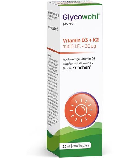 Anwendungsgebiet von Glycowohl Vitamin D3 1000 I.E. + K2 30 µg TropfenWas ist Glycowohl® Vitamin D3 + K2?Glycowohl Vitamin D3 1000 I.E. + K2 30 µg Tropfen ist ein Nahrungsergänzungsmittel und enthält pro Tropfen 1000 I.E. hochwertiges Vitamin D3 kombiniert mit dem patentierten Markenrohstoff Vitamin K2 (K2VITAL®) und Vitamin E. Ergänzt wird die Formulierung durch hochwertiges MCT-Öl zur besseren Aufnahme der Vitamine. Glycowohl® Vitamin D3 + K2 unterstützt die Erhaltung normaler Knochen¹, trägt zur Funktion des Immunsystems² und der normalen Muskelfunktion³ bei und hilft, einen normalen Calciumspiegel⁴ im Blut aufrechtzuerhalten.¹Knochen:Vitamin D und Vitamin K tragen zur Erhaltung normaler Knochen bei.²Immunsystem:Vitamin D trägt zu einer normalen Funktion des Immunsystems bei.³Muskeln:Vitamin D trägt zur Erhaltung einer normalen Muskelfunktion bei.⁴Calcium:Vitamin D trägt zu einem normalen Calciumspiegel im Blut bei.Wirkstoffe / Inhaltsstoffe / ZutatenZutaten von Glycowohl Vitamin D3 1000 I.E. + K2 30 µg Tropfen:Mittelkettige Triglyceride (MCT, aus Kokosnuss), Vitamin K2 MK7 (mind. 99,7% all-trans, K2VITAL®), D-α-Tocopherylacetat, Cholecalciferol.K2VITAL® ist eine Handelsmarke vonBalchem Corporation und deren Tochtergesellschaften.Zusammensetzungpro Tagesdosis (= 1 Tropfen)% NRV*Vitamin E1,8 mg15%Vitamin K230 µg40%Vitamin D31000 I.E. (25 µg)500%* NRV = Nährstoffbezugswert gemäß Lebensmittelinformations-Verordnung (EU) Nr. 1169/2011GegenanzeigenBei bekannter Überempfindlichkeit gegenüber einen der oben genannten Inhaltsstoffe sollte dieses Produkt nicht angewendet werden.Stillende und Schwangere sollten Vitamin D3 und Vitamin K2 nur nach Rücksprache mit ihrem Arzt einnehmenAuf die Einnahme weiterer Vitamin-Khaltiger Lebensmittel ist zu verzichtenPersonen, die gerinnungshemmende Medikamente (vom Cumarintyp) einnehmen, sollen vor dem Verzehr von Vitamin-K-haltigen Nahrungsergänzungsmitteln ärztl ...