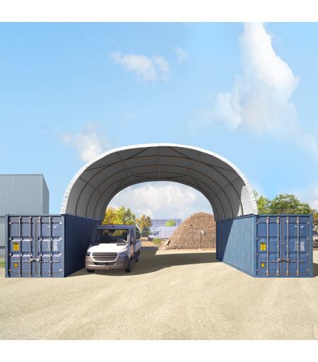 8x6m Container-Überdachung, PE-Plane, weiß, mit Statik: Lassen Sie sich von der flexiblen TOOLPORT Containerüberdachung in weiß in den Maßen 8x6m überzeugen und verbinden Sie Ihre ISO-Container mit einem wetterfesten und stabilen Dach. Ob als kurz-, mittel- oder langfristige Lösung: Ihre Fahrzeuge, Materialien, Maschinen oder auch Ihr Schüttgut sind sicher und vor allem trocken. Unsere Modelle sind inklusive Befestigungsklammern ausgestattet und bieten entweder eine reißfeste PE-Plane 1400 oder eine sehr reißfeste PRIMEtex PVC-Plane 2300 mit 5 Jahren Garantie. Profitieren Sie bei der Stahl-Konstruktion von einer 10-jährigen Garantie. Die belastbare Traglast beträgt bis zu max. 40 kg/m². Die Containerüberdachung ist unkompliziert und schnell auf verschiedensten Untergründen montierbar. Ein großes Plus: Unsere Produkte werden sowohl mit Statik-Set als auch mit Befestigungs-Set geliefert. Mit der TOOLPORT Container-Überdachung verbinden Sie Ihre Container per einem wetterfesten und stabilen Dach. Mit den Maßen 8x6m eignet sich die TOOLPORT Container-Überdachung in der Farbe weiß ideal als temporäre oder langfristige Fahrzeuggarage, Fahrsilo oder Lager. Ob als Überdachung für Schüttgut, Hackschnitzel oder allgemein zum Wetterschutz von Maschinen, Fahrzeugen und Materialien – dieses Produkt bietet höchste Stabilität für den professionellen Einsatz! Das Gestänge dieser TOOLPORT Container-Überdachung besteht aus robustem Stahl und ist dank Feuerverzinkung vor Korrosion und Rost geschützt. Die abgerundete Konstruktion, bestehend aus Vertikal-Bögen, verringert Krafteinwirkungen und erhöht die Standsicherheit. Die Rohre aus Stahl sind außerdem für hohe Traglasten konzipiert und sowohl stoß-, als auch kratzunempfindlich. Als Plane für die 48m² große Container-Überdachung kommt hochwertiges PE zum Einsatz. Diese Plane ist zu 100 % wasserdicht und durchgehend aus einem Stück gefertigt. Sie besitzt eine Reißkraft von 1400 bzw. 350 g/m² pro 5cm Planenbreite. Durch ein ausgeklügeltes Spannsystem wird die Plane über die Gestänge-Konstruktion fixiert. Zusätzliche Spanngurte sorgen u.a. für eine optimale Straffung der Plane. Ein weiterer, großer Vorteil der TOOLPORT Container-Überdachung: Sie ist auf vielen Untergründen unkompliziert und flexibel montierbar. In den meisten Fällen ist zudem das Einholen einer Baugenehmigung nicht erforderlich und falls doch, profitieren Sie dank der inkludierten Statik in der Regel von einem vereinfachten Verfahren. ...