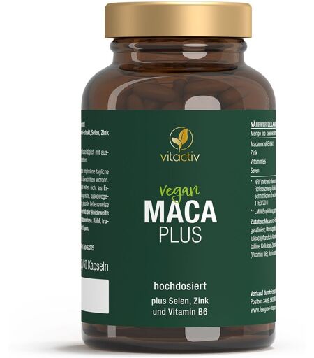 Nahrungsergänzungsmittel sind kein Ersatz für eine abwechslungsreiche und ausgewogene Ernährung und eine gesunde Lebensweise.Die "Power-Knolle" der Inkas für mehr Energie & "Manneskraft" – mit Selen, Zink, Vitamin B6 Männer setzen auf MACA plus Kapseln! Maca ist seit vielen Jahren bei Männern beliebt, die Wert auf körperliche Leistungsfähigkeit legen: Beim Sport und vor allem beim Thema "Manneskraft" ist die peruanische "Power-Knolle" herausragend! Maca kann als natürliches Aphrodisiakum Männern zu einer normalen sexuellen Aktivität verhelfen – und zu sexueller Lust anregen!* In MACA Plus tragen die natürlichen Vitalstoffe Selen, Zink, Vitamin B6 außerdem dazu bei, die Spermienbildung, den Testosteronspiegel, die Fruchtbarkeit und Fortpflanzungsfähigkeit zu normalisieren.* Dieses Produkt überzeugt durch seine Premium-Qualität, geprüft von einem deutschen Institut.*Folgende Aussagen über die Wirkung der Inhaltsstoffe sind laut EFSA1 zulässig bzw. liegen zur Prüfung vor: Maca kann als natürliches Aphrodisiakum zu sexueller Lust anregen Maca trägt zur Normalisierung der Fruchtbarkeit und Fortpflanzungsfähigkeit bei Maca trägt zu einer normalen sexuellen Aktivität bei Maca unterstützt die körperliche und geistige Leistungsfähigkeit Selen kann zu einer normalen Spermienbildung beitragen Vitamin B6 trägt zur Regulierung der Hormontätigkeit bei Vitamin B6 trägt zur Verringerung von Müdigkeit und Ermüdung bei Zink trägt zur Normalisierung der Fruchtbarkeit und Fortpflanzungsfähigkeit bei Zink trägt zur Erhaltung eines normalen Testosteronspiegels im Blut bei1Europäische Behörde für LebensmittelsicherheitKörper, Geist und Sexualität Besonders hochdosiert (500 mg Maca-Extrakt pro Kapsel) Einzigartige Formel mit Maca & Selen & Zink & Vitamin B6 Zur Normalisierung der Fruchtbarkeit und Fortpflanzungsfähigkeit* Zur Normalisierung des Testosteronspiegels im Blut* Kann als natürliches Aphrodisiakum zu sexueller Lust anregen* Auch ideal für Sportler, die ihre Leistungsfähigkeit unterstützen wollen*Zutaten: Macawurzel-Extrakt (Lepidium meyenii), gelatiniert; Überzugmittel: Hydroxypropylmethylcellulose (pflanzliche Kapselhülle); Füllstoff: mikrokristalline Cellulose; Zinkoxid; Pyridoxin-Hydrochlorid (Vitamin B6); Natriumselenit.Nährwerte: Durchschnittliche Nährwerte pro Kapsel % NRV* Maca-Extrakt (4:1) 500 mg ** Selen 8,3 µg 15 % Zink 1,5 mg 15 % Vitamin B6 0,21 mg 15 % * NRV (nutrient reference values), % der empfohlenen Tageszufuhr für Erwachsene gemäß LMIV** LMIV Empfehlung nicht festgelegtVerzehrempfehlung:1 Kapsel täglich mit ausreichend Flüssigkeit einnehmenHinweis:Die angegebene empfohlene Tagesmenge darf nicht überschritten werden.Aufbewahrung:Kühl (6-25 °C) und lichtgeschützt lagern. Außerhalb der Reichweite von kleinen Kindern aufbewahren.Nettofüllmenge: 60 KapselnHerstellerdaten:Feelgood Shop BVPostbus 34095902 RK Venlo-Niederlande ...