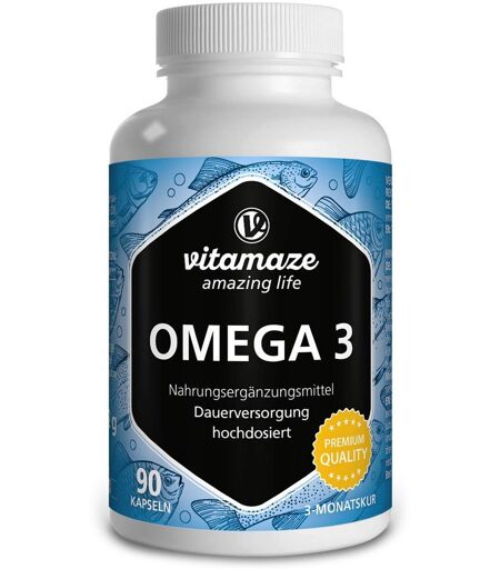 Nahrungsergänzungsmittel sind kein Ersatz für eine abwechslungsreiche und ausgewogene Ernährung und gesunde Lebensweise.Vitamaze Omega 3 hochdosiertDie Omega 3 Weichkapseln versorgen Sie mit 1.000 mg Fischöl und dem idealen hochdosierten Verhältnis von 40% EPA (Eicosapentaensäure) und 30% DHA (Docosahexaensäure) pro Kapsel – und das in bester Bioverfügbarkeit und Qualität von Vitamaze. Und das ist auch wichtig: Denn EPA und DHA tragen zu einer normalen Herzfunktion bei. DHA trägt zur Erhaltung einer normalen Gehirnfunktion und der normalen Sehkraft bei. Hochrein & Hochdosiert: Omega 3 Weichkapseln mit 1000 mg Fischöl pro Kapsel. Wirkung: Wichtige Nährstoffe für Herz, Gehirn und Sehkraft. Höchste Konzentration: 400 mg Eicosapentaensäure und 300 mg Docosahexaensäure (EPA / DHA) pro Kapsel. Eine am Tag für 3 Monate: Eine Weichkapsel am Tag reicht, um Ihren Bedarf abzudecken. 90 Softgel-Kapseln ergeben eine Dauerversorgung für 3 Monate. Nur das Beste für Sie: Das Supplement verzichtet auf alles, was Sie nicht brauchen. Frei von unnötigen Zusatzstoffen, Gentechnik, Allergenen. Und dank Verzicht auf Magnesiumstearat und Siliciumdioxid schnellstens bioverfügbar.Zutaten: Fischöl, Kapselhülle (Gelatine Pulver, Feuchthaltemittel (Glycerin), Wasser), Stabilisator (Vitamin EÖl)Nährwerte: Durchschnittliche Nährwerte: Pro 1 Kapsel NRV* Fischöl 1.000 mg / entspricht EPA 400 mg entspricht DHA 300 mg *NRV = Nährstoffbezugswerte gemäß LebensmittelinformationsVO (LMIV).Verzehrempfehlung:Erwachsenen wird empfohlen täglich eine Kapsel Omega 3 Fischöl mit jeweils 1-2 Gläsern Wasser (300-400 ml) zu verzehren.Hinweis:Die angegebene empfohlene Tagesmenge darf nicht überschritten werden.Aufbewahrung: Kühl (6-25 °C) und lichtgeschützt lagern. Außerhalb der Reichweite von kleinen Kindern aufbewahren.Nettofüllmenge: 90 Kapseln Hersteller: Vitamaze GmbH Heiligenbergstr. 17 69121 Heidelberg ...