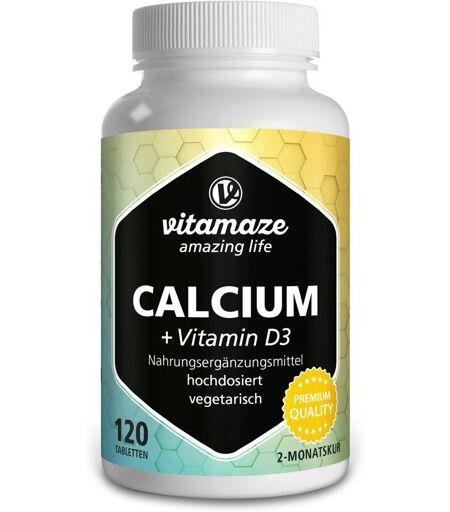 Nahrungsergänzungsmittel sind kein Ersatz für eine abwechslungsreiche und ausgewogene Ernährung und eine gesunde Lebensweise. Vitamaze Calcium 600 mg + Vitamin D3 hochdosiertKalzium, das Baumaterial für die Knochen, ist das wichtigste Mineral im Körper. Es unterstützt die Knochen und Zähne. Das Sonnenvitamin D3 unterstützt die Aufnahme von Kalzium im Darm und funktioniert als Transporter, der Calcium aus dem Blut in die Zellen bringt. D3 trägt ebenfalls zur Erhaltung der Knochen und Zähne bei. Hochdosiert: Calcium 600 mg + Vitamin D3 400 IE pro Tagesdosis Nutzen: Calcium wird für die Erhaltung normaler Knochen/Zähne benötigt & Vitamin D trägt zur Erhaltung normaler Knochen/Zähne bei Vegetarisch: Vitamaze Calcium + Vitamin D3 ist für Vegetarier geeignet Beste Bioverfügbarkeit: Ohne den umstrittenen Zusatzstoff Magnesiumstearat (Magnesiumsalze der Speisefettsäuren) zur optimalen Wirkstoffaufnahme Deutsches Qualitätsprodukt: Das Produkt wird ausschließlich in Deutschland nach HACCP-Konzept produziertDurch besondere Lebensphasen wie Wachstum oder das Alter, entsteht ein erhöhter Kalzium-Bedarf. Auch ein Vitamin D3-Mangel ist nicht selten. Das Vitamaze Kombi-Präparat ist mit den zwei Wirkstoffen genau aufeinander abgestimmt, um diesen Mangel auszugleichen und die Knochen und Zähne zu erhalten.Vitamaze Calcium wird aus Pflanzenfasern (nicht-tierische Inhaltsstoffe) und Vitamaze Vitamin D3 wird aus vegetarischem Lanolin hergestellt.Calcium und Vitamin D3 haben folgende Funktionen im Körper: Calcium wird für die Erhaltung normaler Knochen benötigt & Vitamin D trägt zur Erhaltung normaler Knochen bei Calcium wird für die Erhaltung normaler Zähne benötigt & Vitamin D trägt zur Erhaltung normaler Zähne bei Vitamin D trägt zu einer normalen Aufnahme/Verwertung von Calcium und Phosphor bei Vitamin D trägt zu einem normalen Calciumspiegel im Blut bei Calcium & Vitamin D3 haben eine Funktion bei der Zellteilung. Calcium & Vitamin D3 tragen zu einer normalen Muskelfunktion bei. Calcium trägt zu einer normalen Blutgerinnung bei Calcium trägt zu einem normalen Energiestoffwechsel beiZutaten: Calciumcarbonat, Füllstoff (Mikrokristalline Cellulose), Modifizierte Stärke, Cholecalciferol, (Vitamin D3)Nährwerte: Durchschnittliche Nährwerte pro Kapsel pro 2 Kapseln % NRV* Calcium 300 mg 600 mg 75 % Vitamin D3 5 µg 10 µg 100 % * % NRV= Nährstoffbezugswerte für die tägliche Zufuhr (Verordnung(EU) Nr. 11692011) Verzehrempfehlung: Nehmen Sie täglich zwei Tabletten mit 1-2 Gläsern Wasser ein.Hinweis:Die angegebene empfohlene Tagesmenge darf nicht überschritten werden.Aufbewahrung: Kühl (6-25 °C) und lichtgeschützt lagern. Außerhalb der Reichweite von kleinen Kindern aufbewahren.Nettofüllmenge: 120 TablettenHerstellerdaten: Vitamaze GmbH Heiligenbergstr. 17 69121 Heidelberg ...
