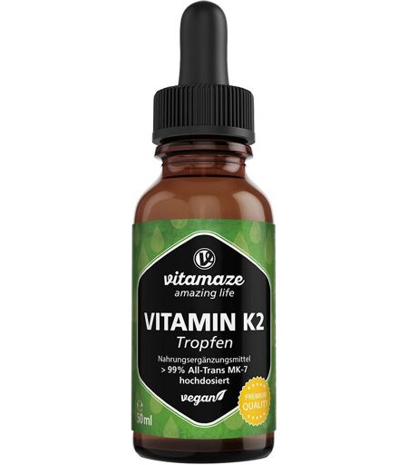 Nahrungsergänzungsmittel sind kein Ersatz für eine abwechslungsreiche und ausgewogene Ernährung und gesunde Lebensweise.Vitamin K2 Tropfen MK7 20 µg hochdosiertVitamin K2 ist ein wichtiges Vitamin, das zu einer normalen Blutgerinnung und zur Erhaltung normaler Knochen beiträgt. Natürliches Vitamin K2 kommt hauptsächlich in grünem Blattgemüse vor, welches oft nicht ausreichend aufgenommen wird, um den Tagesbedarf zu decken. Vitamin K2 Tropfen (hochwertige All-Trans-Form: > 99 %) können durch die hohe Bioverfügbarkeit helfen, den Vitamin K2 Haushalt optimal auszugleichen – in hochwertiger Vitamaze-Qualität. Grünes Blattgemüse ist der wichtigste Lieferant für Vitamin K2, von dem wir in der Regel zu wenig essen. Mangelerscheinungen können daher nicht immer ausgeschlossen werden. Daher ist es wichtig, den Vitamin K2 Haushalt optimal auszugleichen, denn Vitamin K2 ist wichtig für Funktionen des menschlichen Organismus: Es trägt zur Erhaltung normaler Knochen und zu einer normalen Blutgerinnung bei.Die Vitamin K2 Tropfen enthalten 20 Mikrogramm Vitamin K2 (MK-7 Menaquinon) pro Tropfen (hochwertige All-Trans-Form: > 99 %). Im Gegensatz zur günstigen cis-Form ist die natureigene All-Trans-Form die aktive Form von Vitamin K2 mit der höchsten Bioverfügbarkeit.Zutaten:Olivenöl, Menachinon MK7 (Vitamin K2)Nährwerte: Durchschnittliche Nährwerte: Pro 1 Tropfen Pro 10 Tropfen* % NRV** Vitamin K2 20 µg 200 µg 266,67 % * Empfohlene Tagesdosis** Prozentsatz der Referenzmenge nach der VO (EU) Nr. 1169/2011 (LMIV) pro TagesdosisVerzehrempfehlung: Nehmen Sie 1x tägich 10 Tropfen ein.Hinweis:Die angegebene empfohlene Tagesmenge darf nicht überschritten werden.Aufbewahrung: Kühl (6-25 °C) und lichtgeschützt lagern. Außerhalb der Reichweite von kleinen Kindern aufbewahren.Nettofüllmenge: 50 ml Hersteller:Vitamaze GmbHHeiligenbergstr. 1769121 Heidelberg ...