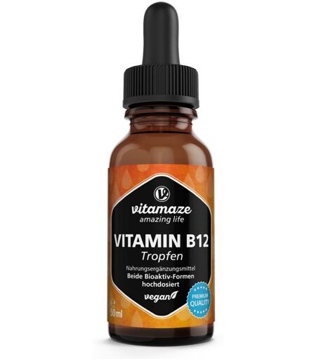 Nahrungsergänzungsmittel sind kein Ersatz für eine abwechslungsreiche und ausgewogene Ernährung und gesunde Lebensweise.Vitamaze Vitamin B12 100 µg TropfenDie Vitamin B12 Tropfen bestehen aus Methylcobalamin und Adenosylcobalamin (Verhältnis 80:20), den beiden bioaktivsten Versionen des Cobalamins, da beide Formen genauso auch im Körper benötigt werden. Andere Formen müssen erst aufwändig in die bioeigene Form umgewandelt werden. Vitamin B12 ist essentiell für viele Körperfunktionen und trägt außerdem zur Verringerung von Müdigkeit bei. Vitamin B12 findet man fast nur in tierischen Lebensmitteln in ausreichender Menge. Eine körpereigene Produktion an Vitamin B12 gibt es nicht. Eine vegetarische oder vegane Ernährung führt daher langfristig zu einem Vitamin B12 Mangel.Vitamin B12 ist wichtig für viele Vorgänge im Körper: Vitamin B12 trägt zur Verringerung von Müdigkeit und Ermüdung bei. Vitamin B12 trägt zu einem normalen Energiestoffwechsel bei. Vitamin B12 trägt zu einer normalen Funktion des Immunsystems bei. Vitamin B12 trägt zu einer normalen Funktion des Nervensystems bei. Vitamin B12 trägt zu einem normalen Homocystein-Stoffwechsel bei. Vitamin B12 trägt zur normalen psychischen Funktion bei. Vitamin B12 trägt zu einer normalen Bildung roter Blutkörperchen bei. Vitamin B12 hat eine Funktion bei der Zellteilung.Zutaten:Glycerin (pflanzlich), Gereinigtes Wasser, Methylcobalamin (Vitamin B12), Adenosylcobalamin (Vitamin B12).Nährwerte: Durchschnittliche Nährwerte: Pro 1 Tropfen Pro 5 Tropfen % NRV** Vitamin B12 100 µg 500 µg 20000 % * Empfohlene Tagesdosis** Prozentsatz der Referenzmenge nach der VO (EU) Nr. 1169/2011 (LMIV) pro TagesdosisVerzehrempfehlung: Nehmen Sie 1x tägich 5 Tropfen ein.Hinweis:Die angegebene empfohlene Tagesmenge darf nicht überschritten werden.Aufbewahrung: Kühl (6-25 °C) und lichtgeschützt lagern. Außerhalb der Reichweite von kleinen Kindern aufbewahren.Nettofüllmenge: 50 ml Hersteller:Vitamaze GmbHHeiligenbergstr. 1769121 Heidelberg ...