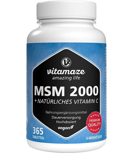 Anwendungsgebiet von MSM 2000+ Vitamin C Acerola TablettenMSM 2000+ Vitamin C Acerola Tabletten - hochdosierte biologisch aktive Schwefelverbindung (2.000 mg MSM-Pulver pro Tagesdosis) ideal kombiniert mit Vitamin C (12 mg pro Tagesdosis) aus natürlichem Acerola Extrakt in gewohnter Vitamaze-Qualität.Vitamin C trägt neben vielen anderen Eigenschaften zu einer normalen Kollagenbildung, einer normalen Knorpelfunktion und einer normalen Funktion der Knochen bei. Außerdem trägt Vitamin C zu einem normalen Energiestoffwechsel und der Verringerung von Müdigkeit und Ermüdung bei.Die Vitamaze MSM 2000 + Vitamin C Tabletten weisen eine deutlich höhere Konzentration als Kapseln in vergleichbarer Größe auf, sind einfach zu schlucken und bequem einzunehmen.Wirkstoffe / Inhaltsstoffe / ZutatenMSM 2000+ Vitamin C Acerola Tabletten enthält:Methylsulfonylmethan (MSM), Acerola Extrakt (Vitamin C).DosierungAnwendungsempfehlung von MSM 2000+ Vitamin C Acerola Tabletten:Täglich 2x1 Tablette mit ausreichend Wasser einnehmen.SchwangerschaftWährend der Schwangerschaft und Stillzeit sollte generell vor dem Verzehr von Nahrungsergänzungsmitteln ein Arzt konsultiert werden.HinweiseDas Produkt ungeöffnet, kühl, trocken und außerhalb der Reichweite von Kindern aufbewahren.Die angegebene empfohlene Verzehrmenge darf nicht überschritten werden.Nahrungsergänzungsmittel sind kein Ersatz für eine ausgewogene und abwechslungsreiche Ernährung und eine gesunde Lebensweise. Nicht für Kinder und Jugendliche geeignet. MSM 2000+ Vitamin C Acerola Tabletten können in Ihrer Versandapotheke www.juvalis.de erworben werden. ...