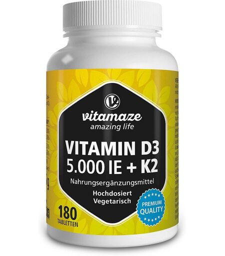 Nahrungsergänzungsmittel sind kein Ersatz für eine ausgewogene und abwechslungsreiche Ernährung und eine gesunde Lebensweise. DIE VORTEILE VON VITAMIN D3 + K2 TABLETTEN Vitamin D3 ist ein Allrounder, wenn es um die Gesundheit geht: Es hilft dabei, Knochen1 und Zähne3 gesund zu erhalten, unterstützt das Immunsystem4 und die Muskeln2 und sorgt dafür, dass der Calciumspiegel5 im Blut im Gleichgewicht bleibt. Außerdem sorgt es dafür, dass der Körper Calcium und Phosphor richtig aufnehmen6 kann und spielt eine Rolle bei der Zellteilung7. Vitamin K2 ist ebenfalls wichtig – es hilft nicht nur bei der Blutgerinnung8, sondern trägt auch zur Gesundheit der Knochen9 bei. Hochdosierte Nährstoffversorgung: Jede vegetarische Tablette liefert 5000 IE Vitamin D3 und deckt den Bedarf für 5 Tage. Mit 180 Tabletten in der praktischen Familienpackung ist eine langfristige und einfache Versorgung mit Vitamin D3 und K2 gewährleistet. Produktion nach HACCP-Standard – Rein vegetarisch: Alle Vitamaze Produkte werden nach HACCP-Standard in Deutschland und Europa hergestellt. Es sind ausschließlich vegetarische Inhaltsstoffe enthalten. Ohne Allergene und unnötige Zusätze: Bei Vitamaze können Sie sich darauf verlassen, dass nur Inhaltsstoffe verwendet werden, die wirklich notwendig sind. Der Verzicht auf Magnesiumstearat sorgt außerdem für eine verbesserte Aufnahme der Nährstoffe im Körper. Ideale Zusammensetzung: In den Vitamaze Tabletten ist hochdosiertes Vitamin D3 in Kombination mit Vitamin K2 enthalten. Das beugt einer Unterversorgung vor und verhindert gleichzeitig auch eine Überdosierung bei Einhaltung der Verzehrsempfehlung. Langfristige Nährstoffversorgung: Vitamaze bietet Ihnen eine Vielzahl an Produkten, die darauf ausgelegt sind, die Gesundheit, Fitness und Leistungsfähigkeit auf natürliche Weise zu fördern. Ob für mehr Wohlbefinden oder eine gezielte Unterstützung der Körperfunktionen – Vitamaze-Produkte sind eine wertvolle Ergänzung. Zutaten: Füllstoff (Mikrokristalline Cellulose), Cholecalciferol (Vitamin D3), Menachinon MK7 (Vitamin K2). Nährwertangaben Pro 1 Tablette NRV* Vitamin D3 5-Tagesdosis 125 μg (5000 IE) 2500 % = 1-Tagesdosis 25 μg (1000 IE) 500 % Vitamin K2 5-Tagesdosis 100 μg 133,33 % = 1-Tagesdosis 20 μg (1000 IE) 26,67 % * Prozentsatz der Referenzmenge nach der VO (EU) Nr. 1169/2011 pro Tagesdosis (Nährstoffbezugswert) Inhalt: 45 g = 180 vegetarische Tabletten Verzehrsempfehlung: Alle 5 Tage 1 Tablette mit ausreichend Wasser einnehmen. Hinweise: Die angegebene empfohlene Verzehrmenge darf nicht überschritten werden. Nahrungsergänzungsmittel sind kein Ersatz für eine ausgewogene und abwechslungsreiche Ernährung und eine gesunde Lebensweise. Nicht für Kinder und Jugendliche geeignet. Das Produkt ungeöffnet, kühl, trocken und außerhalb der Reichweite von Kindern aufbewahren. Sollten Sie gerinnungshemmende Medikamente einnehmen, sprechen Sie vor der Einnahme mit Ihrem Arzt. Von der EU (EFSA - Europäische Behörde für Lebensmittelsicherheit)... ...
