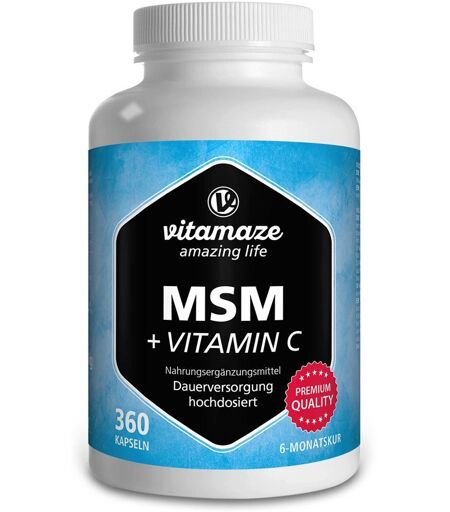 Nahrungsergänzungsmittel sind kein Ersatz für eine ausgewogene und abwechslungsreiche Ernährung und eine gesunde Lebensweise. DIE VORTEILE VON MSM + VITAMIN C MSM ist eine organische Schwefelverbindung, die der Körper unter anderem für die Bildung von Bindegewebe, Knorpel und Haut benötigt. Schwefel ist ein wichtiger Bestandteil vieler körpereigener Strukturen, insbesondere im Bereich der Gelenke und des Bewegungsapparates. Die MSM Kapseln von Vitamaze sind sinnvoll ergänzt durch hochdosiertes Vitamin C, welches zu einer normalen Kollagenbildung für eine normale Funktion von Knorpel1 und Knochen2 beiträgt und zusätzlich das Immunsystem3 unterstützt. Vitamin C ist ein wasserlösliches Vitamin und als Antioxidans schützt es die Zellen vor oxidativem Stress4. MSM + Vitamin C Kapseln ist ideal für alle, die gezielt ihre Knorpelfunktion1 , die körpereigene Kollagenbildung1,3,5,6,7 und das Immunsystem3 unterstützen möchten Ideale Packungsgröße: Mit 360 Kapseln ist eine Dauerversorgung für 6 Monate gesichert. Produktion nach HACCP-Standard: Alle Vitamaze Produkte werden nach HACCPStandard in Deutschland und Europa hergestellt. Ohne Allergene und unnötige Zusätze: Bei Vitamaze können Sie sich drauf verlassen, dass nur das reinkommt, was auch wirklich notwendig ist. Der Verzicht auf Magnesiumstearat sorgt außerdem für eine verbesserte Aufnahme der Nährstoffe im Körper. Ideale Zusammensetzung: 99,9 % reine Formulierung mit besonders hoher Bioverfügbarkeit durch die Nutzung von MSM mit einer Gewebefeinheit von 60-80 Mesh. Mit 1334 mg MSM Pulver pro Tagesdosis sind die Kapseln optimal dosiert für die tägliche Ergänzung. Sie enthalten zudem hochdosiertes Vitamin C Zutaten: Methylsulfonylmethan/Dimethylsulfon (MSM), Kapselhülle (Gelatine vom Rind), Ascorbinsäure (Vitamin C) Inhaltsstoff 1 Kapsel 6 Kapseln NRV** Methylsulfonylmethan (MSM) 667 mg 1334 mg *** Vitamin C 40 mg 80 mg 100% * Empfohlene Tagesdosis ** Prozentsatz der Referenzmenge nach der VO (EU) Nr. 1169/2011 pro Tagesdosis (Nährstoffbezugswert) *** Nicht vorhanden Inhalt: 309,6 g = 360 Kapseln Verzehrsempfehlung: Täglich 2x1 Tablette mit ausreichend Wasser einnehmen. Hinweise: Die angegebene empfohlene Verzehrmenge darf nicht überschritten werden. Nahrungsergänzungsmittel sind kein Ersatz für eine ausgewogene und abwechslungsreiche Ernährung und eine gesunde Lebensweise. Nicht für Kinder und Jugendliche geeignet. Das Produkt ungeöffnet, kühl, trocken und außerhalb der Reichweite von Kindern aufbewahren. Während der Schwangerschaft und Stillzeit sollte generell vor dem Verzehr von Nahrungsergänzungsmitteln der Arzt konsultiert werden. Von der EU (EFSA - Europäische Behörde für Lebensmittelsicherheit) zugelassene und als sichereingestufte Wirkungen: 1 Vitamin C trägt zu einer normalen Kollagenbildung für eine normale Knorpelfunktion bei 2 Vitamin C trägt zu einer normalen Funktion des Immunsystems bei 3 Vitamin C trägt zu einer normalen Kollagenbildung für eine normale Funktion der Knochen 4 Vitamin C... ...