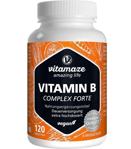 Anwendungsgebiet von Vitamaze VITAMIN B-Complex extra hochdosiert veganVitamaze VITAMIN B-Complex extra hochdosiert vegan vereint alle 8 wichtigen B-Vitamine in einer Tablette und in hochdosierter Form für eine umfassende Nährstoffversorgung. B-Vitamine spielen eine wichtige Rolle bei einer Vielzahl von Körperfunktionen. So unterstützen die Vitamine B1, B2, B3, B5, B6, B7 und B12 den normalen Energiestoffwechsel. Außerdem tragen die Vitamine B1, B2, B3, B7 und B12 zu einer normalen Funktion des Nervensystems bei. Vitamin B5 trägt zu einer normalen geistigen Leistung bei. Wirkstoffe / Inhaltsstoffe / ZutatenZutaten von Vitamaze VITAMIN B-Complex extra hochdosiert vegan: Füllstoff (Mikrokristalline Cellulose), DL-Choline Bitartrate, Modifizierte Stärke, Inositol, p-Aminobenzoesäure, Niacin, Calcium D-Pantothenate, Riboflavin, Thiamin HCl, Pyridoxin HCl, Biotin, Folsäure, Methylcobalamin. Nährwertangaben pro 1/2 Tablette NRV*: Vitamin B1 (Thiamin) 20,00 mg 1818 % Vitamin B2 (Riboflavin) 20,00 mg 1428 % Vitamin B3 (Niacin) 50,00 mg 312 % Vitamin B5 (Pantothensäure) 40,00 mg 666 %) Vitamin B6 15,00 mg 1071 % Vitamin B12 25 mcg 1000 % Vitamin B9 (Folsäure) 500 mcg 250 % * Prozentsatz der empfohlenen Tagesdosis nach Anlage 13 der Verordnung VO (EU) 1169/2011 (LMIV) GegenanzeigenBei bekannter Überempfindlichkeit gegenüber einem der oben genannten Inhaltsstoffe sollte dieses Produkt nicht angewendet werden.DosierungVerzehrempfehlung von Vitamaze VITAMIN B-Complex extra hochdosiert vegan: Täglich 1 Tablette mit ausreichend Wasser verzehren.HinweiseNicht für Kinder und Jugendliche geeignet. Bei Verbrauchern mit Schluckbeschwerden oder bei unzureichender Flüssigkeitszufuhr besteht Erstickungsgefahr. Die empfohlene tägliche Verzehrmenge darf nicht überschritten werden. Nahrungsergänzungsmittel sollten nicht als Ersatz für eine ausgewogene un ...