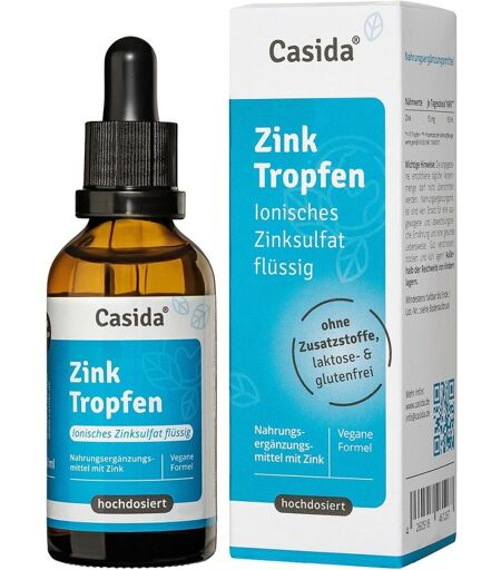 Die Zink Tropfen von Casida sind hochdosiert mit 15 mg Zink pro empfohlener Tagesdosis von 10 Tropfen. Die Zink Tropfen enthalten Zink in ionischer Form – die am besten bioverfügbare Form von Zink. Zink ist ein wichtiges Mineral, das in vielen Prozessen im Körper eine wichtige Rolle spielt.