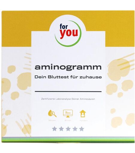 Anwendungsgebiet von For You aminogramm TestSchlappheit, kränkeln, Leistungstief – Typische Symptome eines Aminosäuremangels. Du bist betroffen? Gehe mit dem for you Aminosäure Bluttest für Zuhause der Ursache auf den Grund. Aminosäuren sind die wichtigsten Bausteine des Lebens – sie machen glücklich, halten schlank und jung, fördern Kreativität und Höchstleistung. Das for you aminogramm ist Dein essentieller Schlüssel zur Gesundheit! Bestimme mit dem Aminosäuren Bluttest den Aminosäuren-Spiegel Deines Körpers. Gesundheit testen - mit unserem Bluttest für zuhause kein Problem! Bequem & einfach zuhause Probe entnehmen Zertifizierte Laboranalyse Deiner Blutwerte Verständlich aufbereitete Testergebnisse Leicht umsetzbare Empfehlungen for you aminogramm Aminosäuren sind der Schlüssel zum Leben. Der Mensch besteht aus diesen Eiweißbausteinen. Unsere Muskeln, Hormone, Organe, Knochen, Haut und unser Immunsystem sind aus Aminosäuren aufgebaut und auf sie angewiesen. Täglich. Eiweiß ist der Schlüssel zur Gesundheit. Aminosäuren machen uns körperlich und geistig leistungsstark. Wir sind belastbarer und ausdauernder und bleiben in Stresssituationen gelassener. Sie helfen uns bei Stimmungstiefs und Schlafstörungen, machen satt und arbeiten für die schlanke Linie. Nur, wenn unser Eiweiß-Pool gut gefüllt ist, sind wir kreativ, konzentriert und mental stark. Unser Körper kann sich nach großer Beanspruchung schneller erholen und wir fühlen uns energiegeladen und gut gelaunt. Ein Aminosäurenmangel kann sich also stark auf Körper und Psyche auswirken. Das for you aminogramm ist ein Bluttest für Zuhause und misst die für Lebensfreude, Energie und Gesundheit entscheidenden Eiweißbausteine - 8 essentielle, 4 semi-essentielle und 8 weitere nicht-essentielle Aminosäuren. Unseren Bluttest kannst Du schnell, einfach und bequem von zuhause aus durchführen. Innerhalb weniger Tage stellen wir online D ...