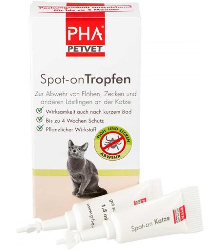 Anwendungsgebiet von Pha Spot-on Tropfen für KatzenPHA Spot-onTropfen verteilen sich rasch als feiner, seidiger Film über Haut und Haare der Katze. PHA Spot-onTropfen wehren Flöhe und Zecken am Tier ab und beugen ca. 4 Wochen lang einem Neubefall vor.