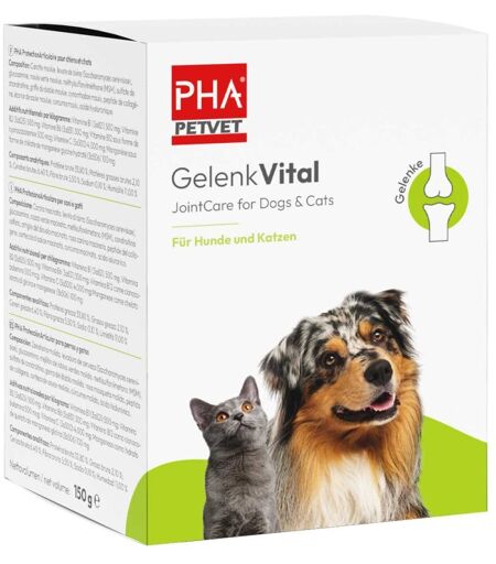 Anwendungsgebiet von PHA GelenkVital für Hunde & KatzenGelenkprobleme im Alter beeinträchtigen die Lebensqualität. Das PHA GelenkVital bietet eine effektive Lösung zur Unterstützung der Mobilität und Verbesserung des Wohlbefindens. Die im PHA GelenkVital enthaltenen Inhaltsstoffe wie Grünlippmuschelpulver, MSM und Hyaluronsäure können helfen, alters-, und/oder ernährungsbedingte Defizite im Gelenkstoffwechsel zu mindern.