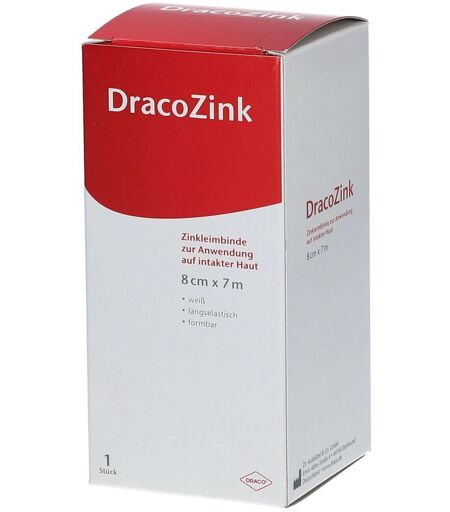 Draco® DracoZink ZinkleimbindeLangsam trocknende, mit Zinkoxid imprägnierte Binde aus Mischgewebe als Dauerverband.DracoZink ist ein Dauerverband zur Behandlung von phlebologischen Indikationen, sowie Muskelfaserrissen, Muskelzerrungen etc. ...