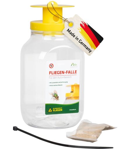 Gardigo Fliegenfalle Monitoring inklusive Lockmittel Produktnummer: 0692300181 Fliegen fangen im Außenbereich An vielen Orten im Freien hat man Probleme mit Fliegen: am Komposthaufen, auf landwirtschaftlichen Betrieben, Campingplätzen oder überall da, wo Mülltonnen stehen. An diesen Orten können Sie jetzt die Gardigo Fliegen-Falle einsetzen, um Stubenfliegen und Schmeißfliegen zu fangen. Auch wenn man viele Fliegen im Haus hat, kann man draußen eine Fliegenfalle aufstellen, damit die Insekten in die Falle gelockt werden, statt ins Haus zu fliegen. Dazu sollte man die Falle nicht direkt am Haus aufstellen, sondern einigen Abstand halten, damit die Fliegen vom Haus weg gelockt werden. Um Fliegen von Balkon und Terrasse weg zu locken, sollte die Falle auch nicht direkt am Ort des Fliegenbefalls aufgestellt werden. Schließlich wollen sie lästige Fliegen fernhalten und nicht zu sich locken. Lockstoff inklusive Der Fliegenköder ist für Fliegen anziehend. Die meisten Nützlinge werden davon jedoch nicht angelockt. Nach wenigen Tagen setzt die Wirkung ein und hält dann mehrere Monate an. Anwendung: Füllen Sie die Fliegenfalle zur Hälfte mit Wasser. Den Köderbeutel im Inneren der Falle müssen Sie nicht öffnen, denn er besteht aus einem wasserlöslichen Material. Schrauben Sie den Deckel zu und ziehen Sie den oberen Teil mit den Einlassöffnungen nach oben heraus. Am besten hängt oder steht die Falle an einem warmen Ort mit Sonneneinstrahlung. Zum Aufhängen liegt ein Kabelbinder bei. Die Lockwirkung setzt innerhalb von 2-3 Tagen ein und hält mehrere Monate an. Überprüfen Sie den Füllstand regelmäßig und füllen Sie bei starker Verdunstung Wasser nach. Der mit Fliegen gefüllte Behälter kann mit einem neuen Köder (separat erhältlich) bestückt oder geschlossen entsorgt werden. Hinweis: Trocken lagern. Produkt und Produktreste können im Hausmüll entsorgt werden. Darf nicht in de Hände von Kindern gelangen. Biozide sicher verwenden. Vor Gebrauch stets Kennzeichnung und Produktinformation lesen. Lockstoffbeutel löst sich im Wasser auf und gibt den Fliegenlockstoff frei Langanhaltende Wirkung: Setzt nach wenigen Tagen ein und lockt die Insekten über mehrere Monate an Gezielter Einsatz: lockt Schmeißfliegen und Stubenfliegen an, aber in der Regel keine Nützlinge Insektenfalle für Camping, Landwirtschaft, Pferdestall, Mülltonnen, Komposthaufen etc. Fliegen von Terrasse, Haus, Balkon usw. fernhalten Herstellerinformationen: tevigo GmbH Raiffeisenstr. 2D 38159 Vechelde, Deutschland eMail: service@tevigo.de Herstellernr. 66805 Verbraucherhinweise Sicherheitshinweise Inhalt/Behälter gemäß den nationalen Vorschriften der Abfallentsorgung zuführen .Darf nicht in die Hände von Kindern gelangen. ...